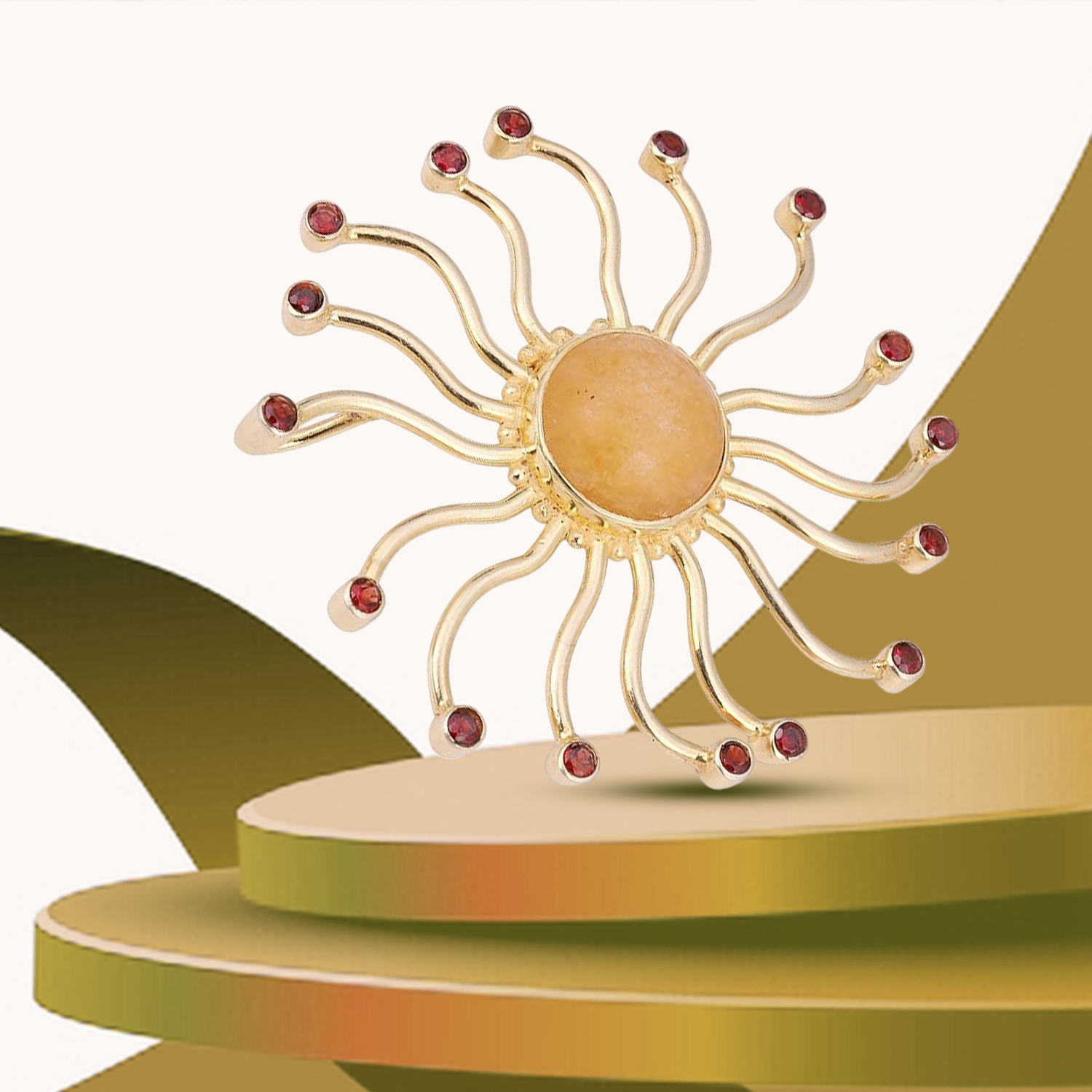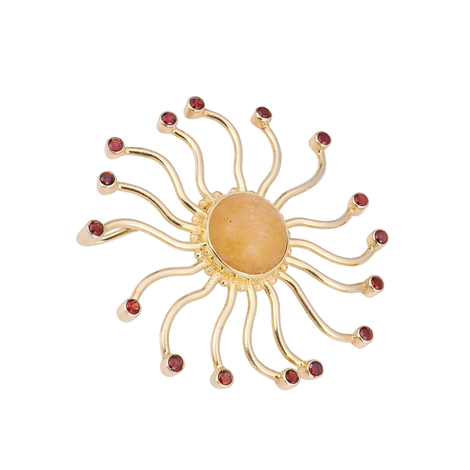 Add a radiant touch of elegance to your jewelry collection with the Meadows Yellow Jade & Garnet Pendant. This handcrafted pendant is made from 925 sterling silver, finished with a rich yellow gold plating for a luxurious and lasting shine.