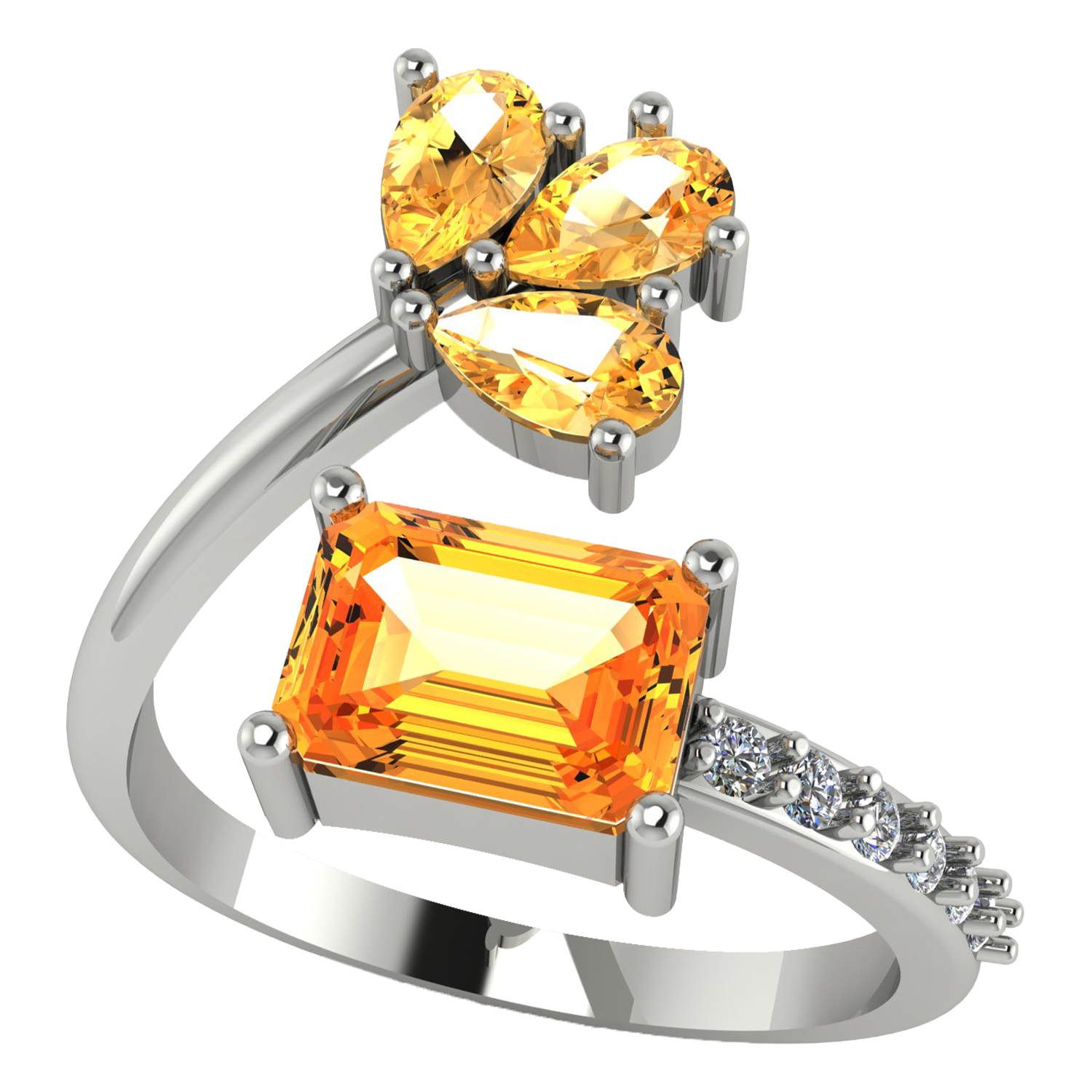Brighten up your jewelry collection with this Citrine Adjustable Silver Ring, designed to radiate warmth and elegance. The ring showcases a rectangular-cut citrine gemstone in a secure prong setting, exuding a golden-yellow glow that symbolizes vitality and positivity. Above the main stone, a floral-inspired cluster of three pear-shaped citrine gemstones adds a graceful and nature-inspired touch.