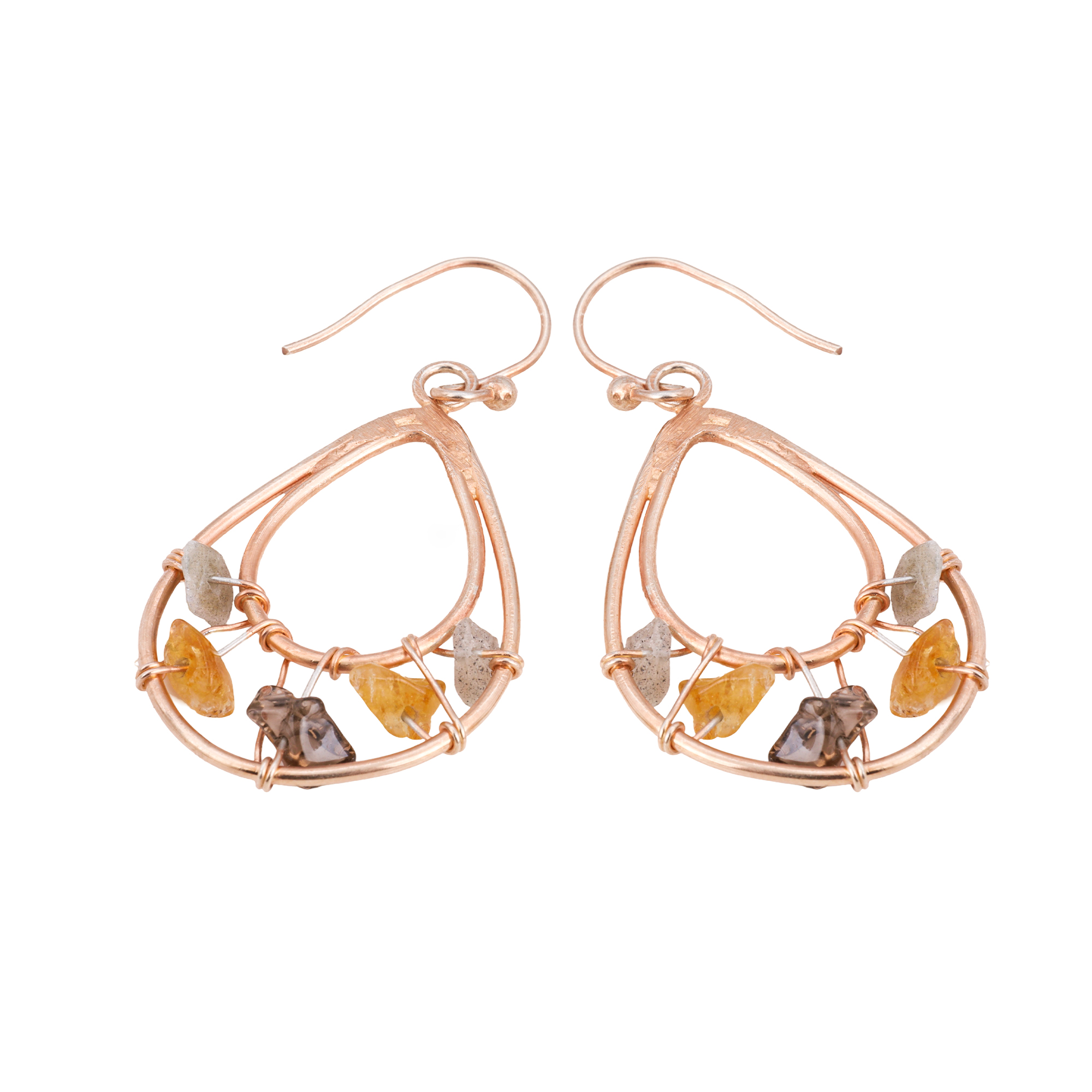 Elevate your style with these exquisite handcrafted dangle earrings from Meadows. Featuring natural rough-cut Citrine and Smoky Quartz, set in 925 sterling silver with a radiant yellow gold finish, these earrings offer a raw, organic charm that blends nature and elegance seamlessly.