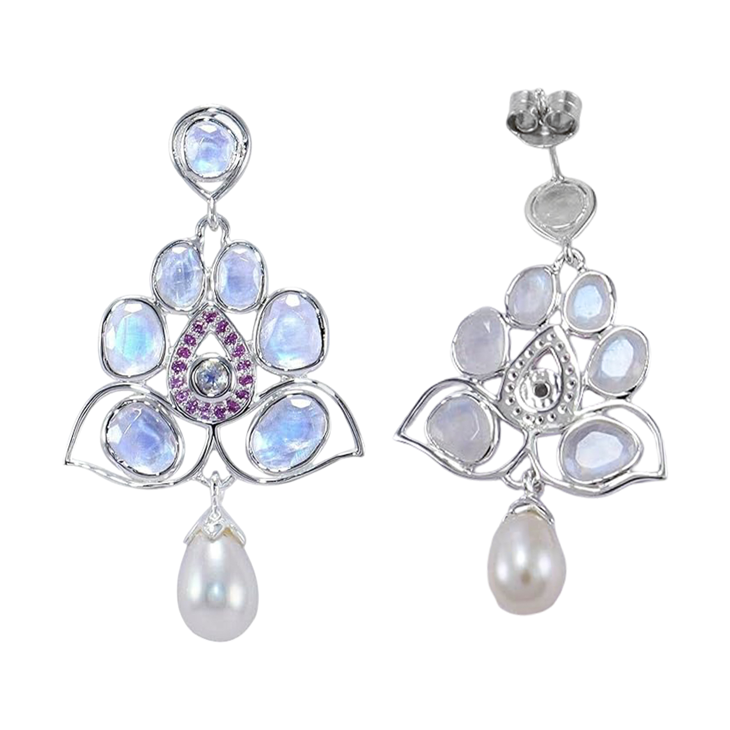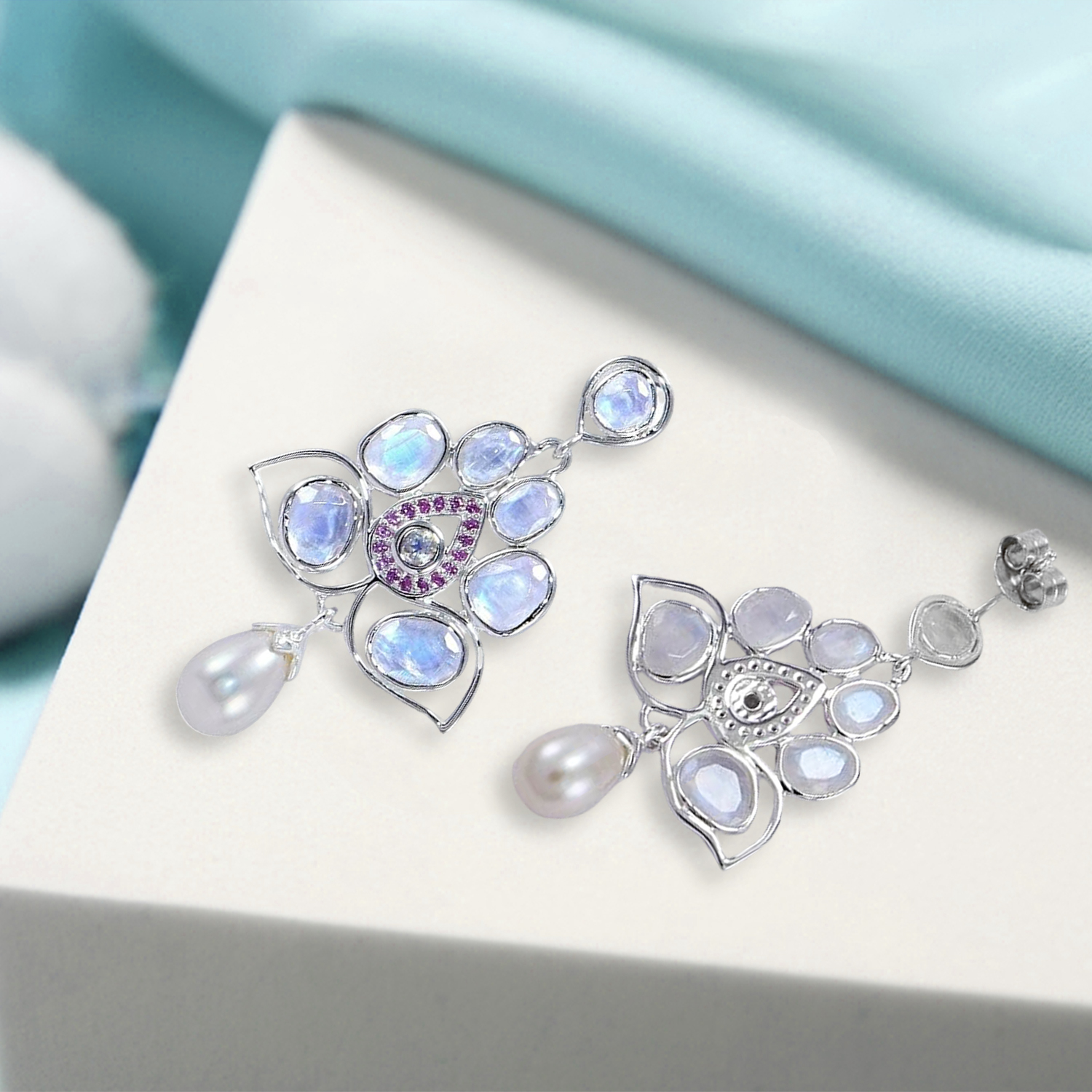 Designed for those who appreciate fine artistry, these earrings showcase a mix of drop, round, and talpe-shaped stones ranging from 1mm to 6x9mm, set securely with a comfortable push-back fastening. The balanced arrangement highlights the fiery brilliance of ruby, the iridescent shimmer of moonstone, and the gentle glow of pearls, making these earrings a versatile choice for special occasions or everyday elegance.