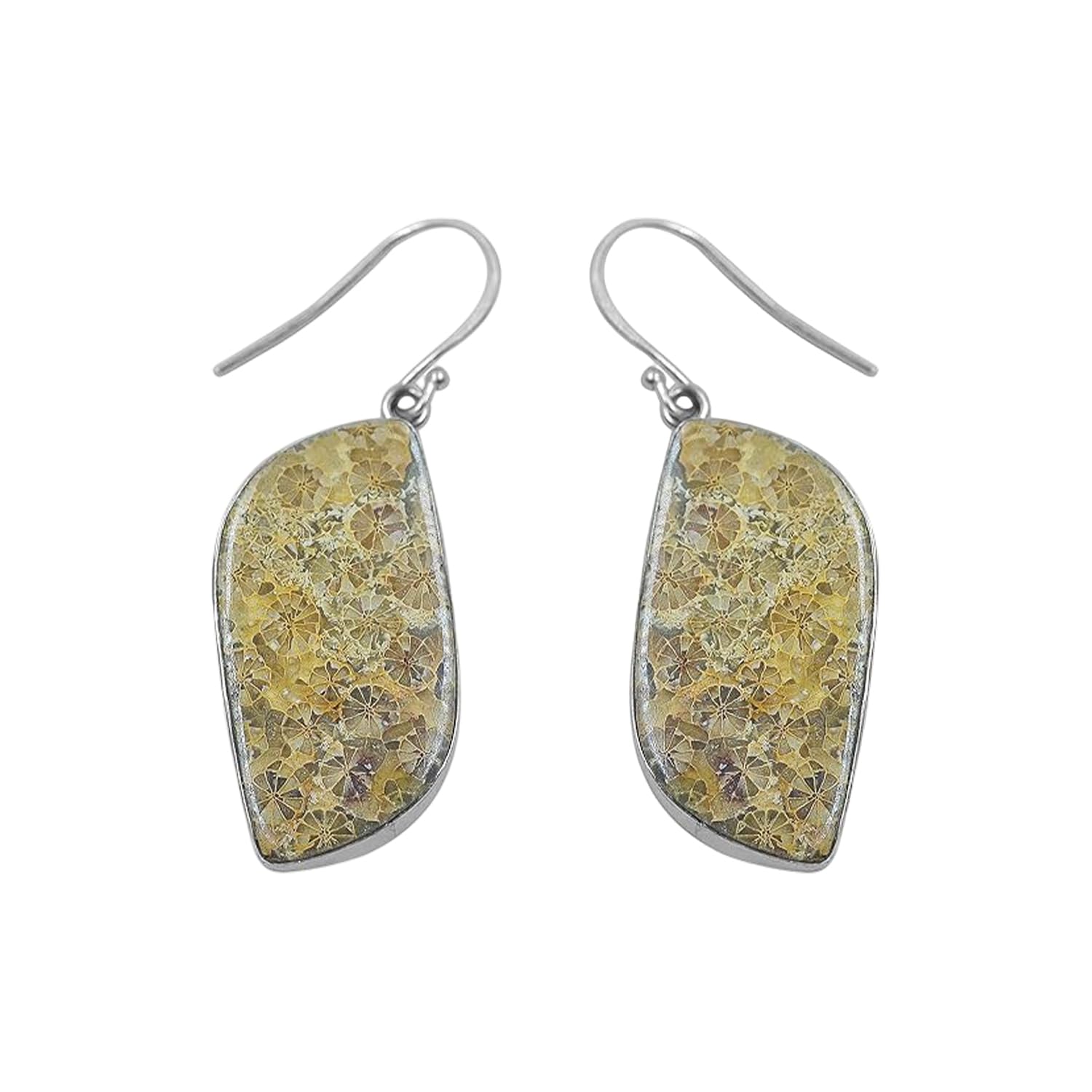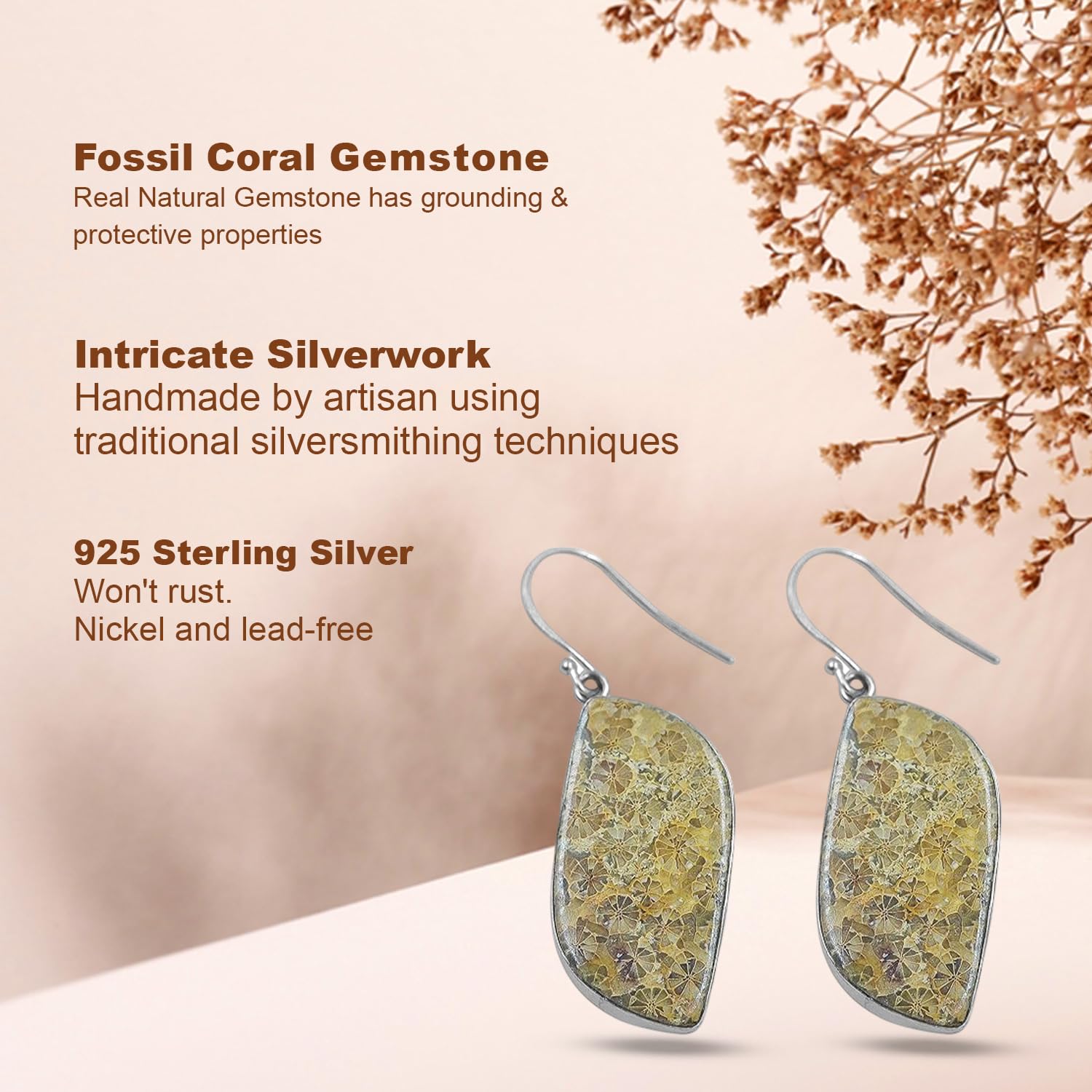 These graceful Fossile Coral Dangle Earrings in 925 sterling silver bring an elegant drop of calm to your look. Known as the stone of intuition, Fossile Coral helps soothe the mind and spirit. Handcrafted in Jaipur with ethically sourced stones and artisan techniques, they’re a go-to for special moments or subtle daily sparkle.