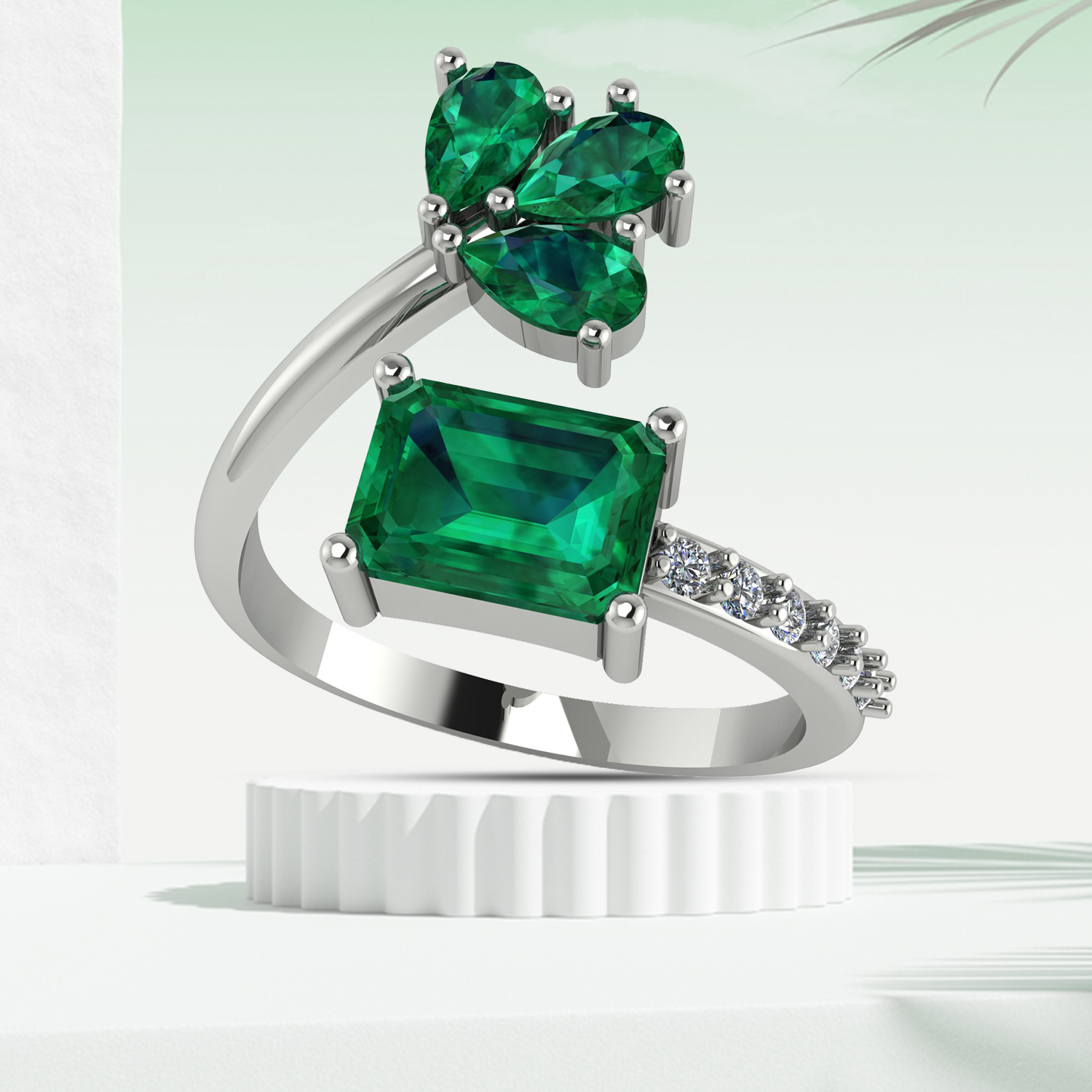 Above the centerpiece, a stunning floral cluster of three pear-shaped emerald green stones adds a graceful, nature-inspired aesthetic. The band is adorned with a row of sparkling white CZ accents, enhancing the brilliance of the piece. Crafted from 925 sterling silver, this ring offers durability, lasting shine, and tarnish resistance. Its adjustable design ensures a perfect fit for any finger size.