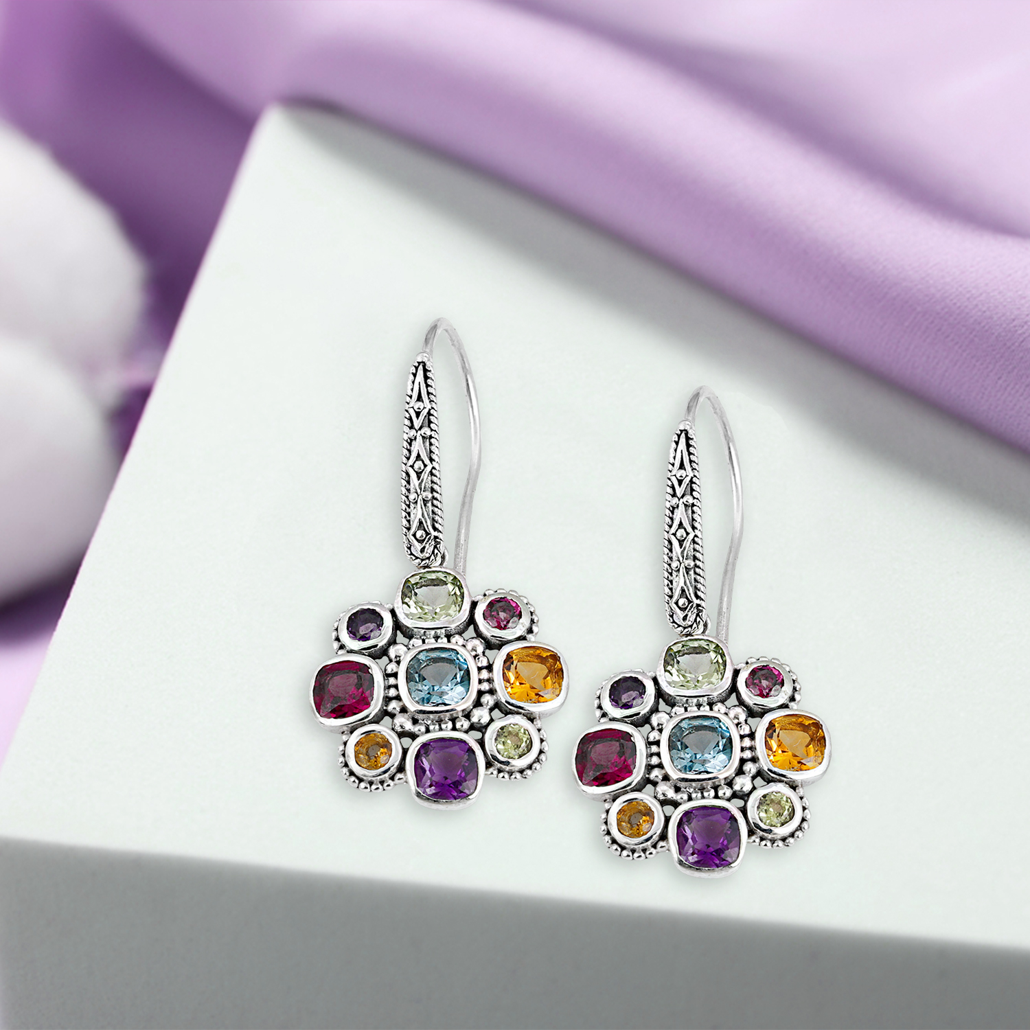 Brighten up your style with Meadows 925 Sterling Silver Multi-Gemstone Dangle Earrings, a stunning mix of elegance, color, and charm. These handcrafted earrings feature a radiant combination of natural multi-colored gemstones, expertly set in pure sterling silver.