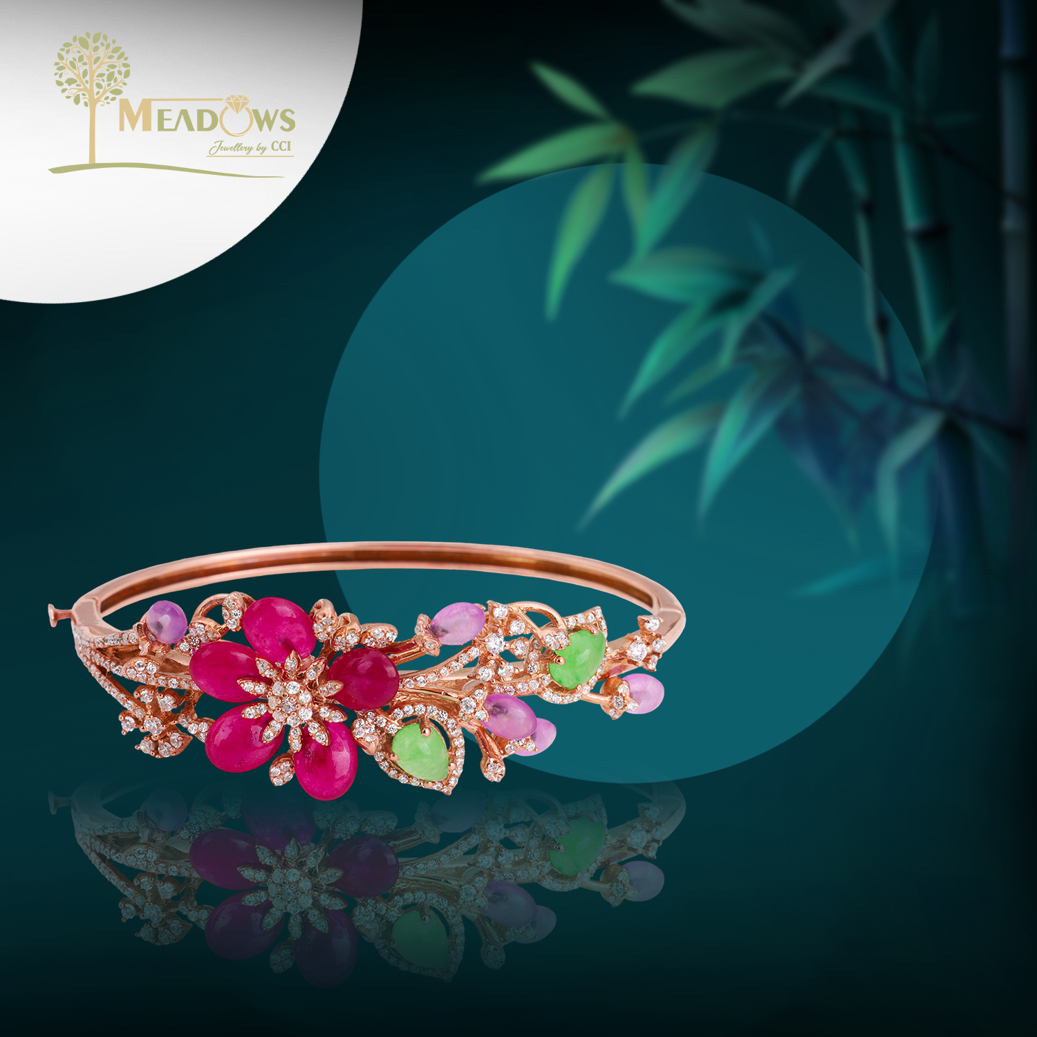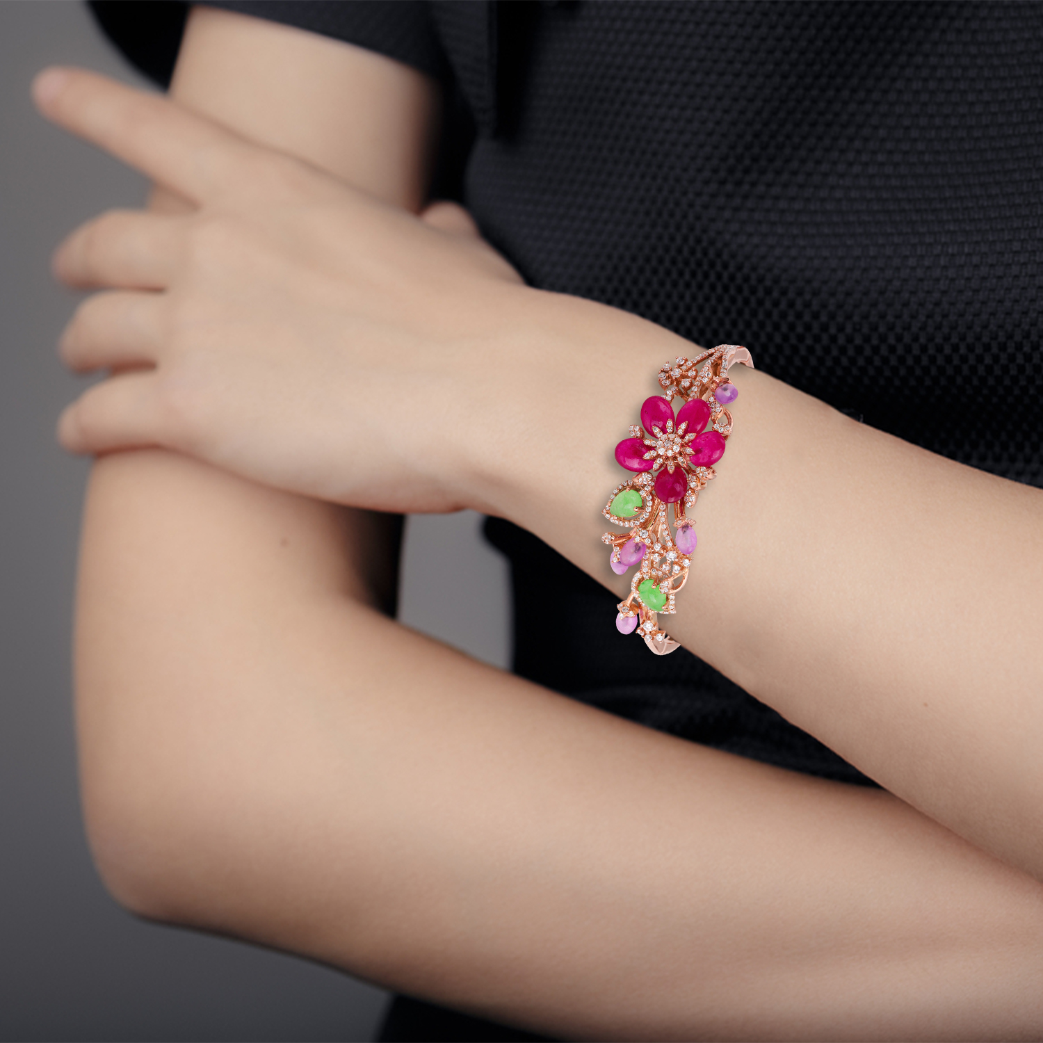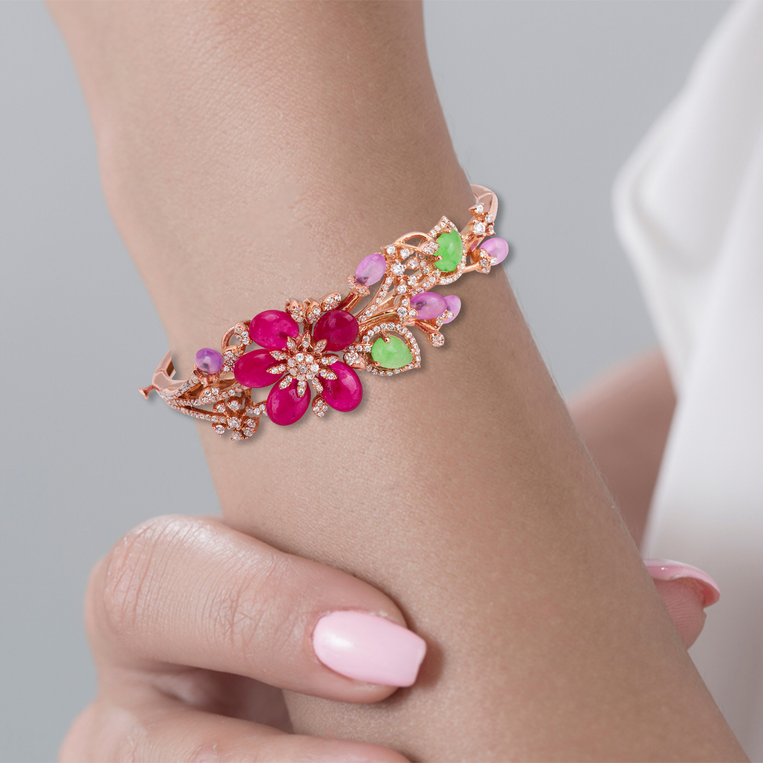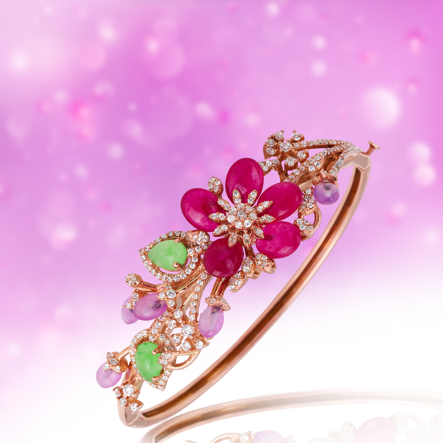 Add a touch of opulence to your jewelry collection with this exquisite floral designer bangle. Crafted with precision and artistry, the bangle features a captivating floral design adorned with vibrant ruby red cabochon stones, soothing lavender amethysts, and glowing green jade pear-shaped stones. Each petal and leaf is delicately accented with high-quality cubic zirconia, creating a dazzling effect that captures light beautifully.