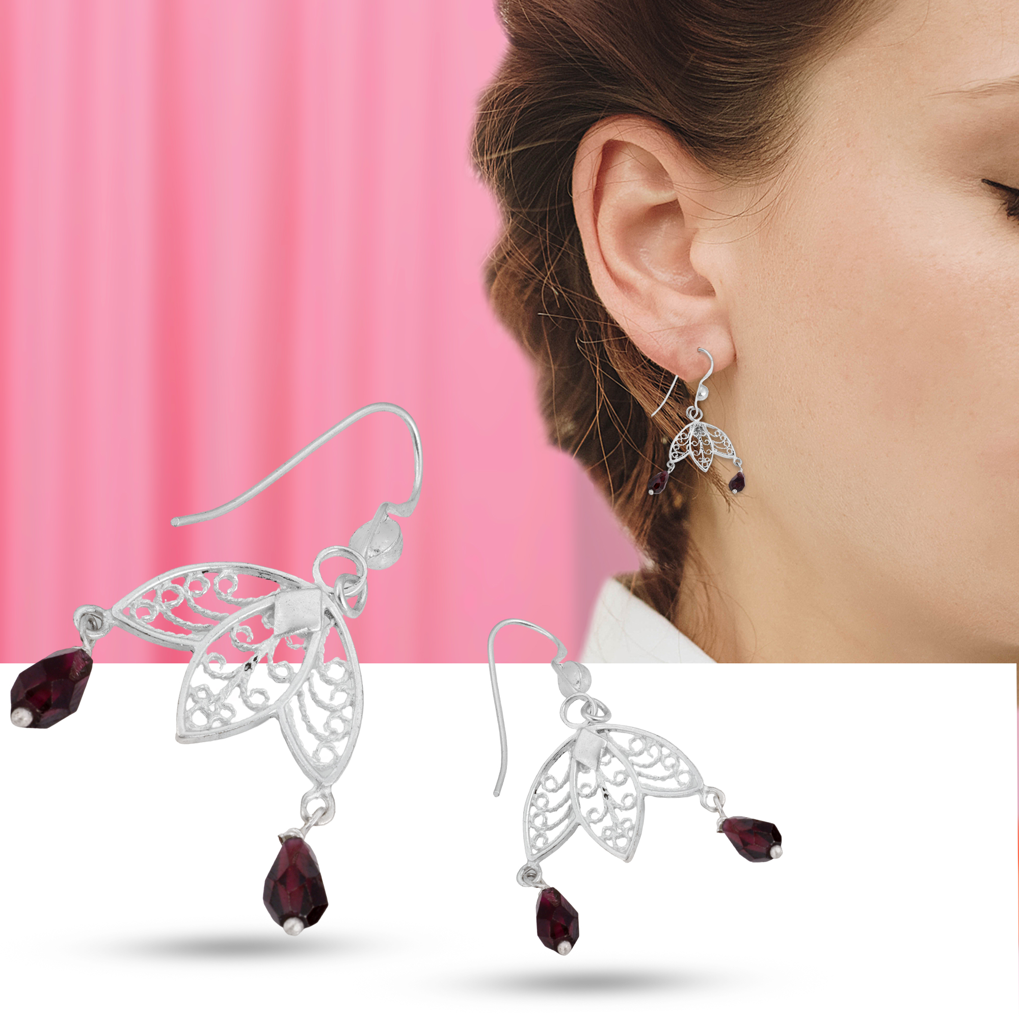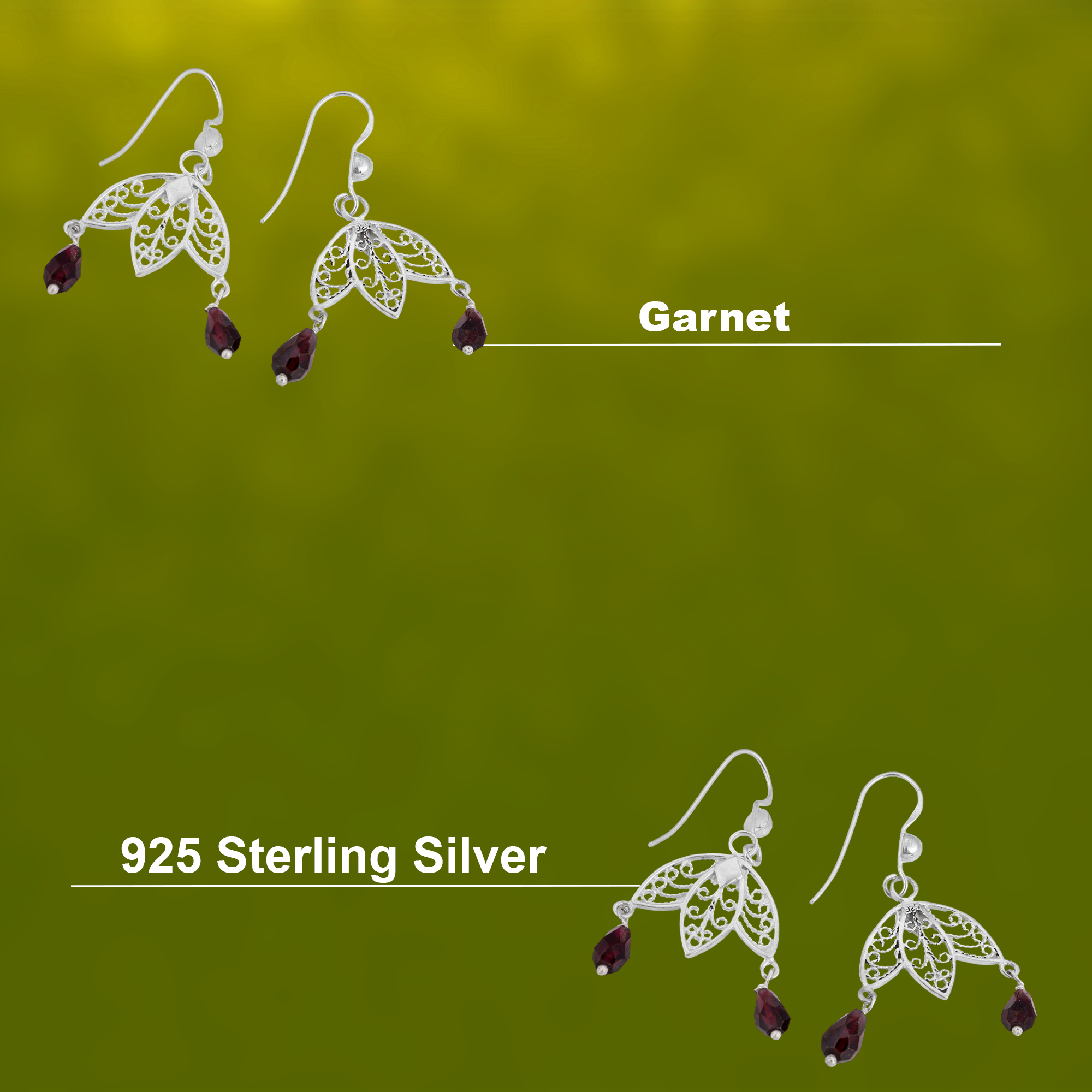 Elevate your style with these beautifully handcrafted dangle earrings featuring deep red natural Garnet gemstones. Set in pure 925 sterling silver with a detailed filigree pattern, these earrings exude vintage charm and sophistication. Hypoallergenic, lightweight, and durable ? perfect for everyday wear or festive occasions.