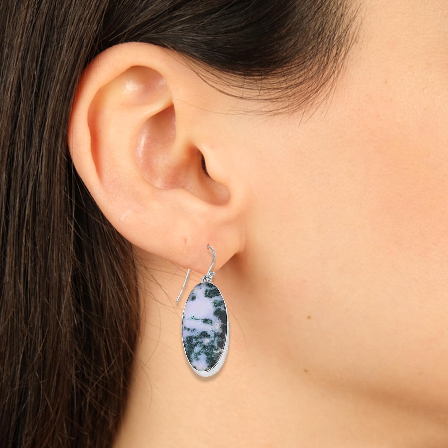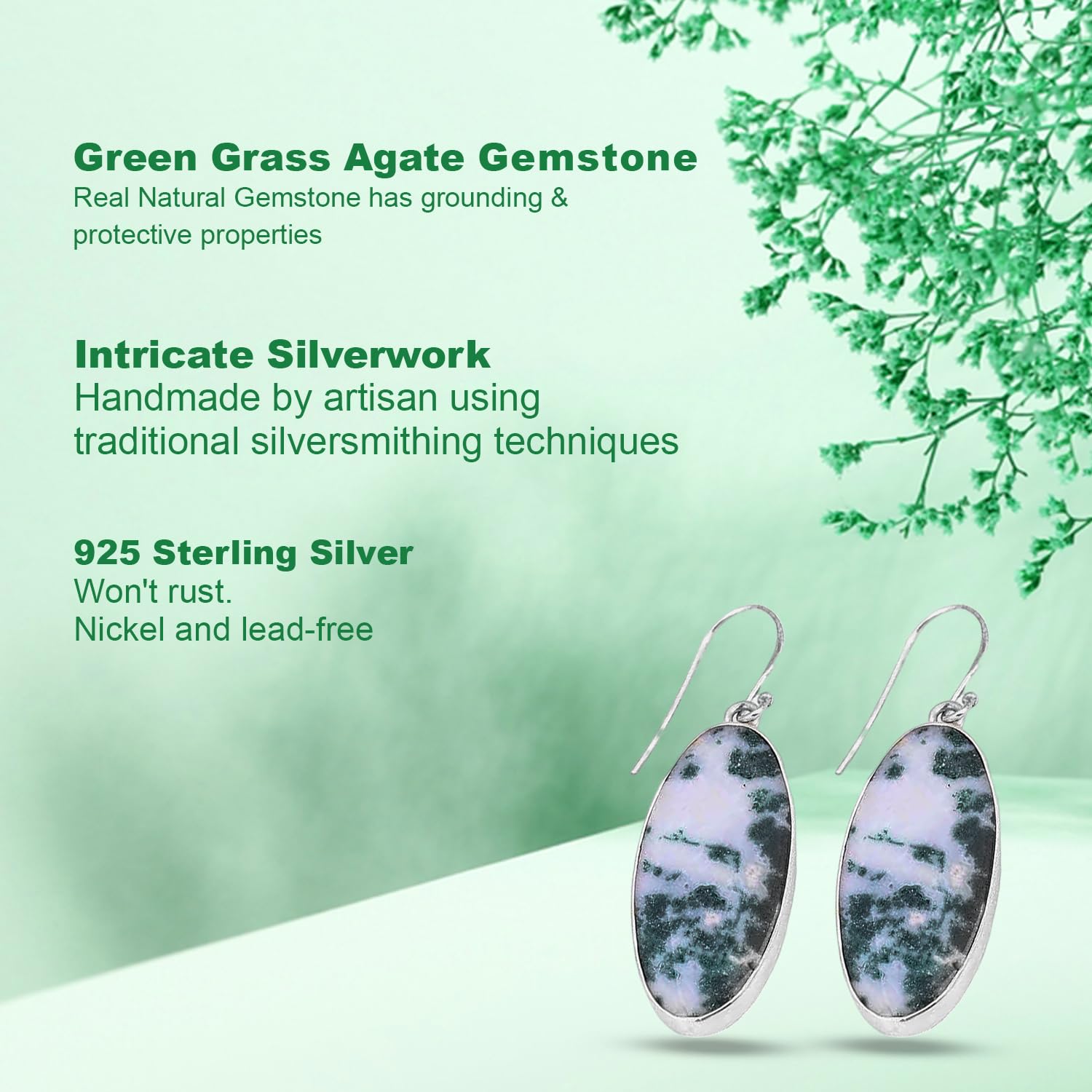 Avoid direct contact with water, perfumes, and harsh chemicals. Store in a dry pouch when not in use.These graceful Green Grass Agate Dangle Earrings in 925 Sterling Silver Earring bring an elegant drop of calm to your look. Known as the stone of intuition, Amethyst helps soothe the mind and spirit. Handcrafted in Jaipur with ethically sourced stones and artisan techniques, they’re a go-to for special moments or subtle daily sparkle.