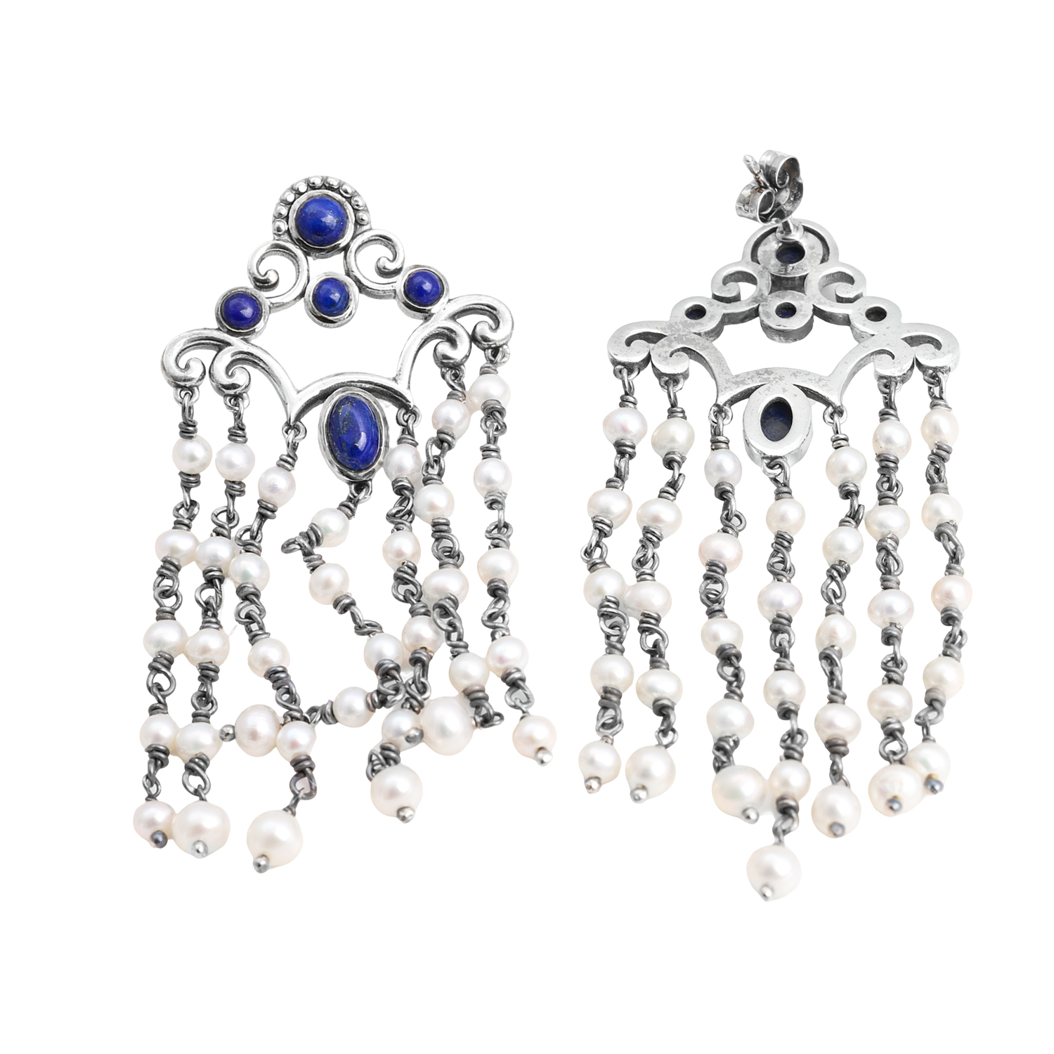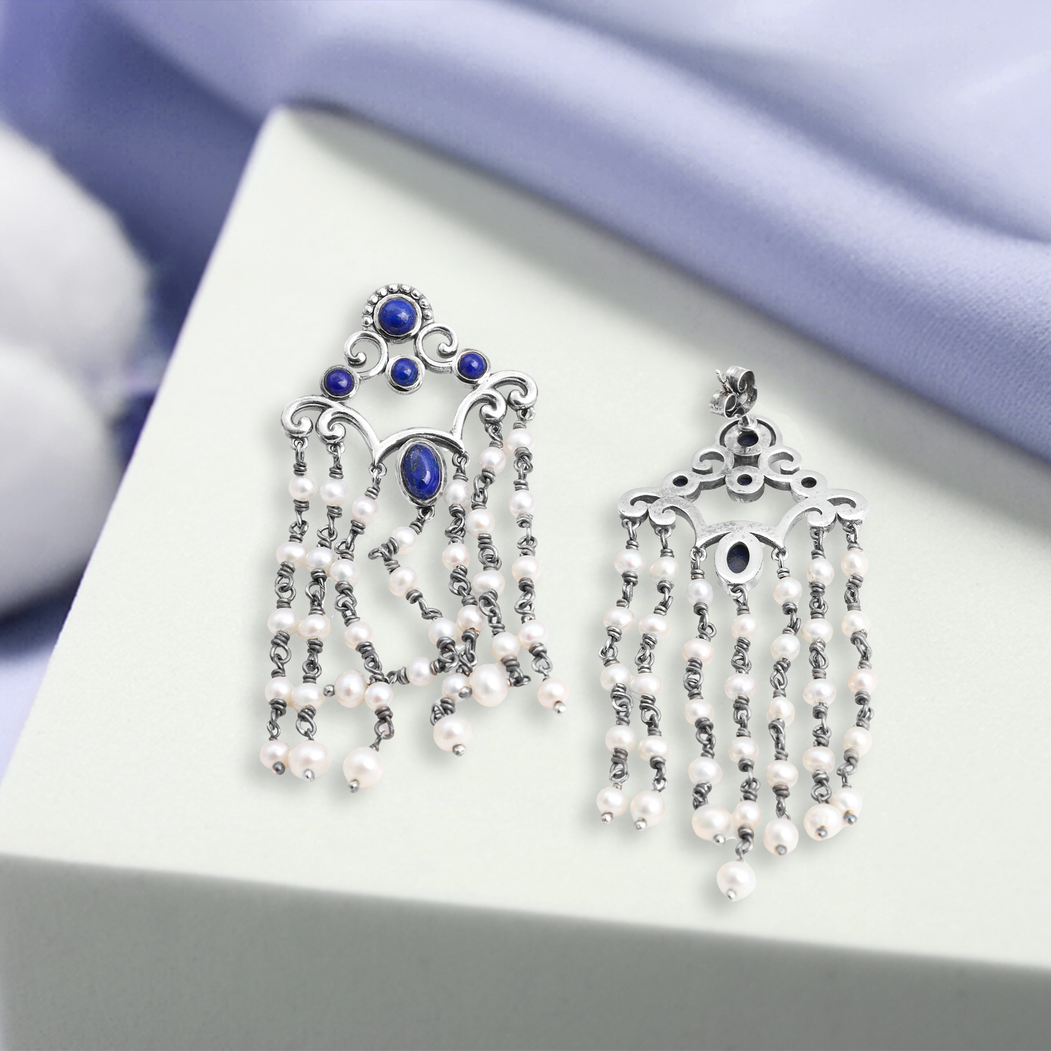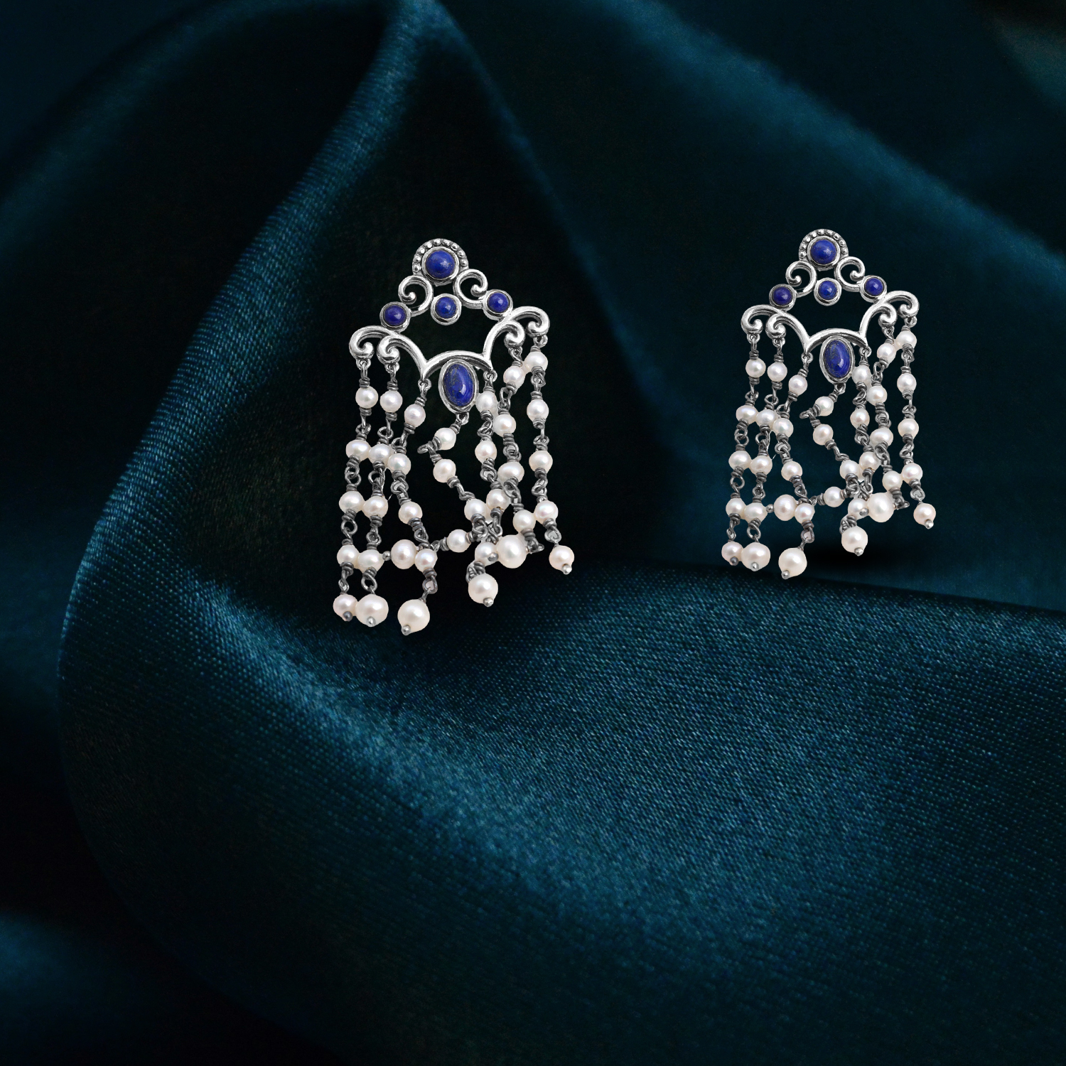 Celebrate timeless elegance and heritage with Meadows 925 Sterling Silver Lapis Lazuli & Pearl Jhumka Beads Earrings. These exquisite handcrafted earrings showcase deep blue natural Lapis Lazuli paired with delicate white Pearls, forming a graceful jhumka silhouette that reflects traditional Indian artistry.