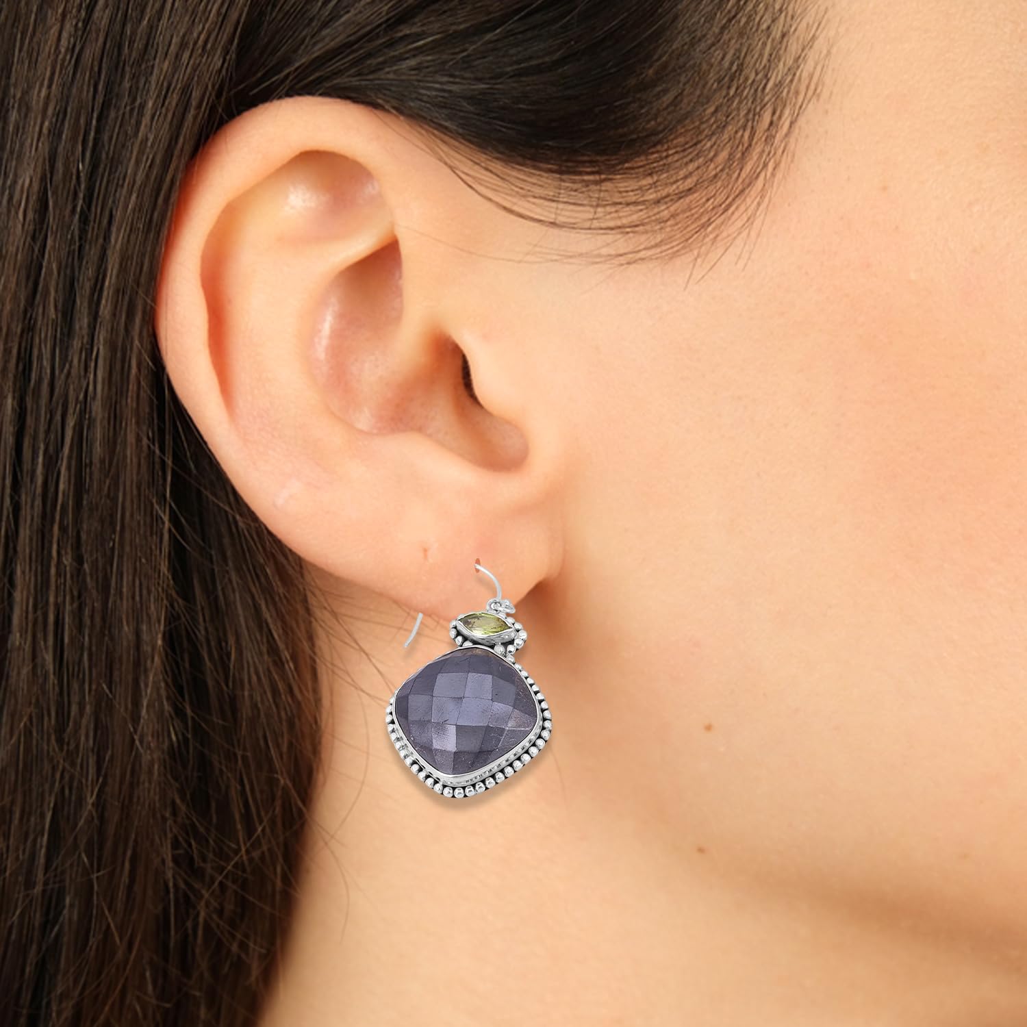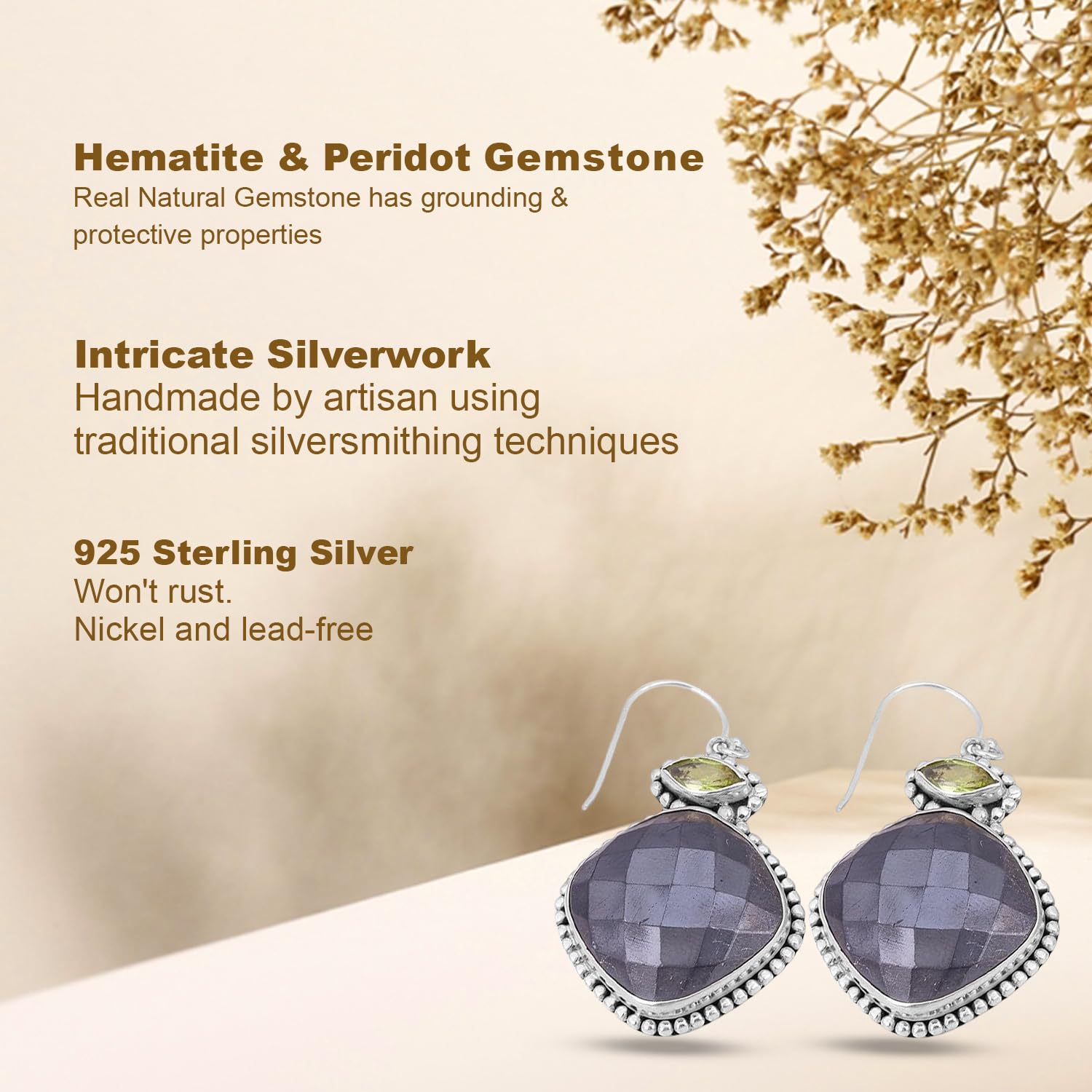 These graceful Hematite & Peridot Dangle Earrings in 925 Sterling Silver bring an elegant drop of calm to your look. Peridot known as the stone of intuition, Hematite helps soothe the mind and spirit.clear thoughts, open communication, and inner peace?known as the stone of truth and wisdom Handcrafted in Jaipur with ethically sourced stones and artisan techniques, they’re a go-to for special moments or subtle daily sparkle.
