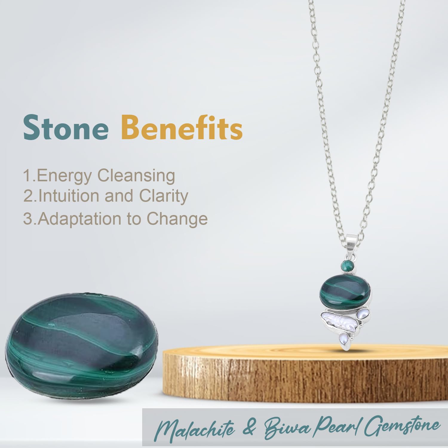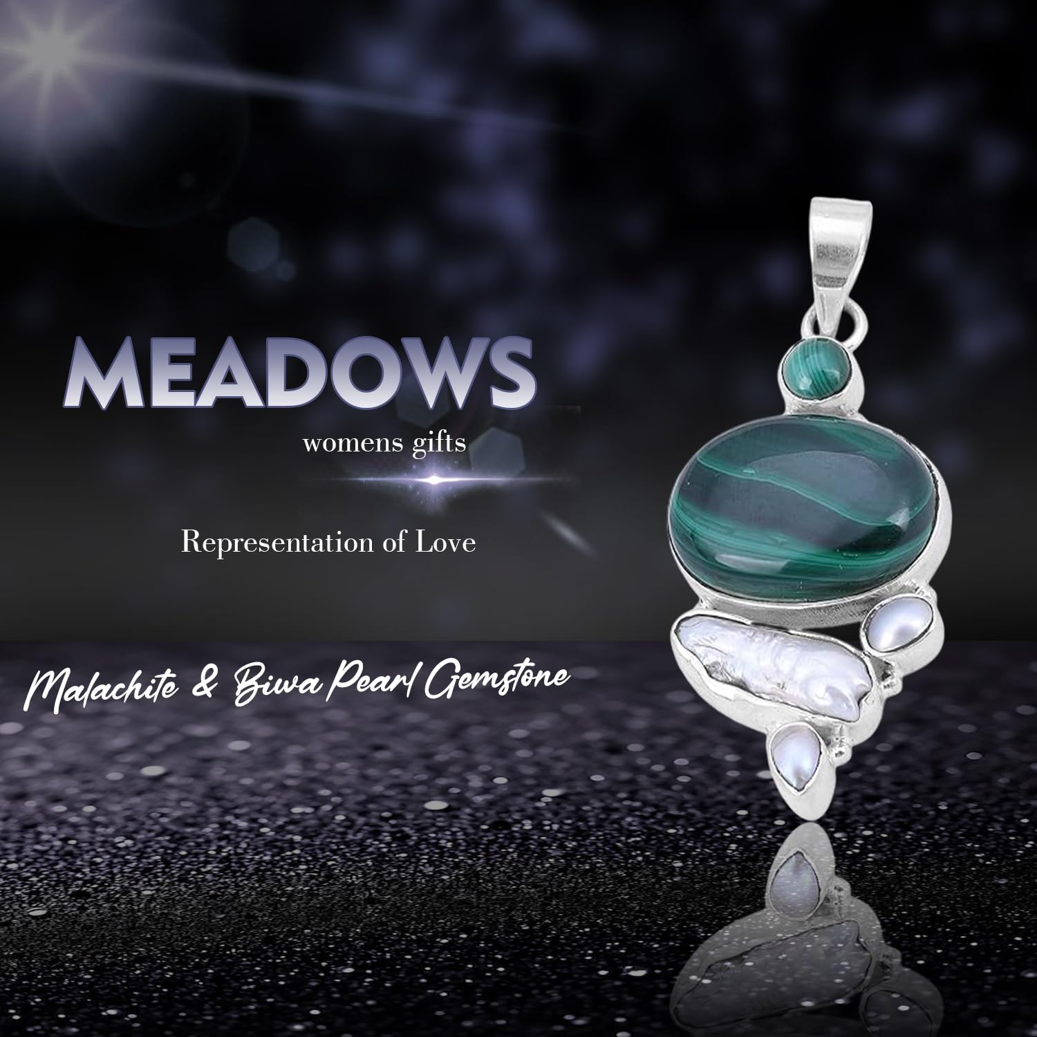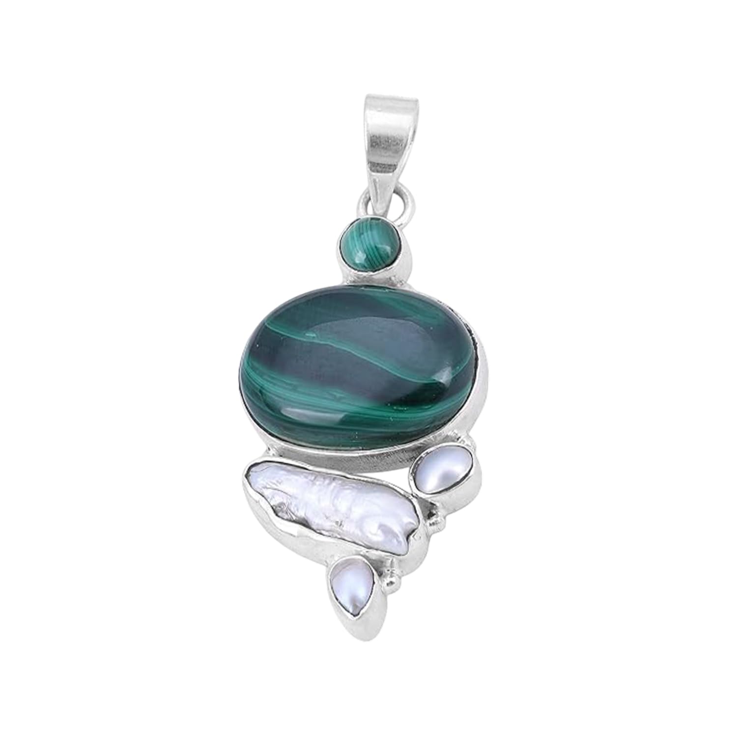 Malachite & Biwa Pearl Pendant, 925 Sterling Silver Gemstone Pendants, Bohemian Pendants