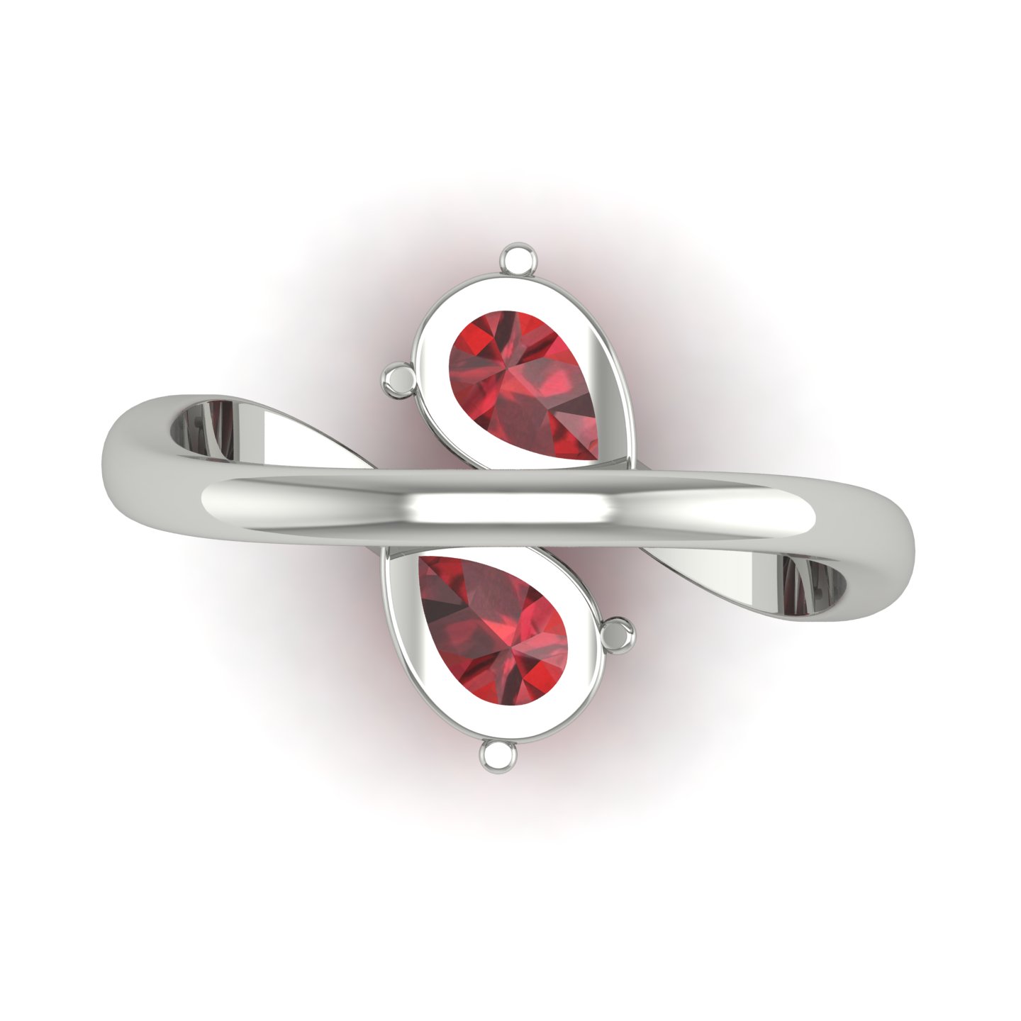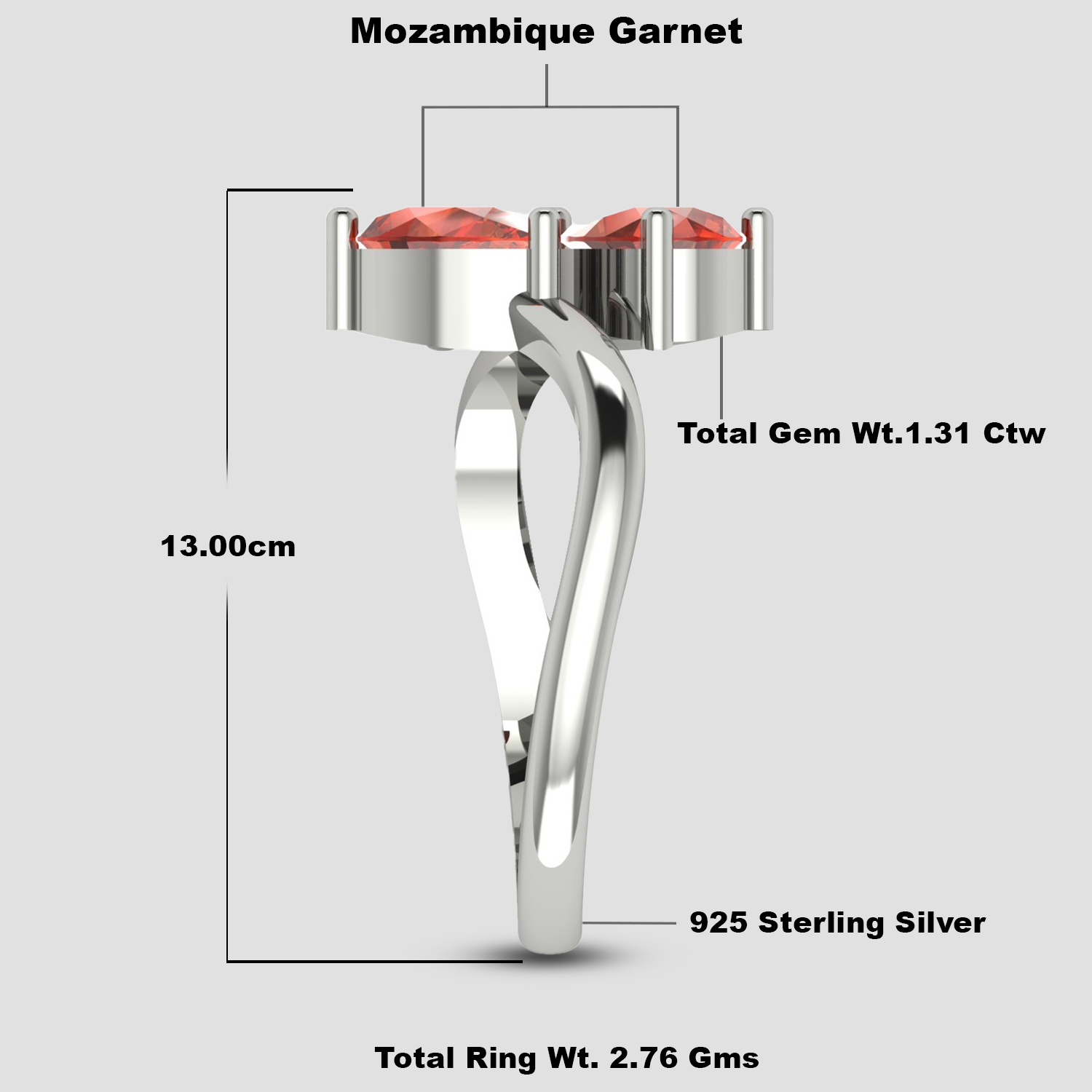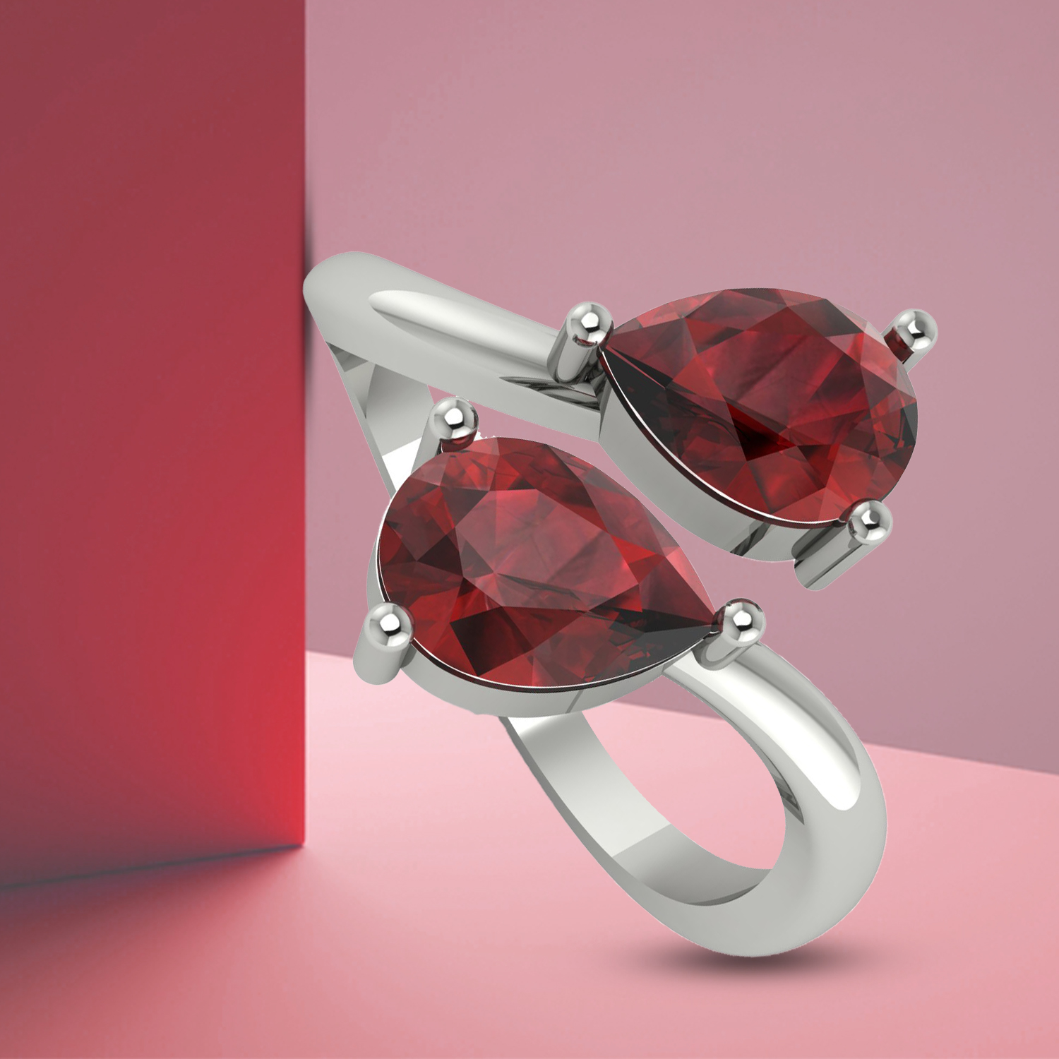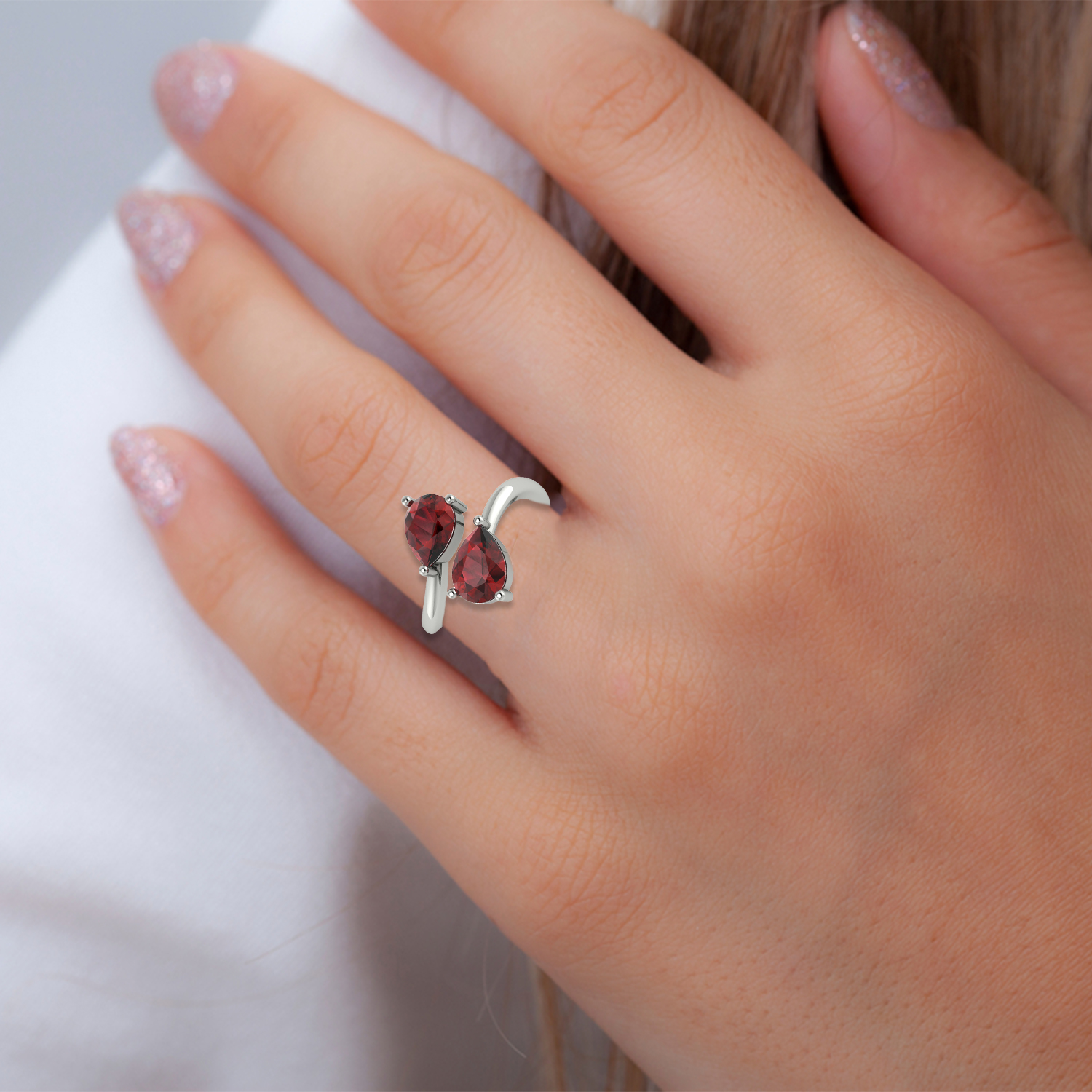 Add a touch of fiery elegance to your collection with this Mozambique Garnet Adjustable Ring, featuring two captivating pear-cut garnet gemstones. The deep red hue of these garnets symbolizes passion, energy, and vitality. The sleek silver band boasts an open-ended, adjustable design, making it easy to fit any finger comfortably.