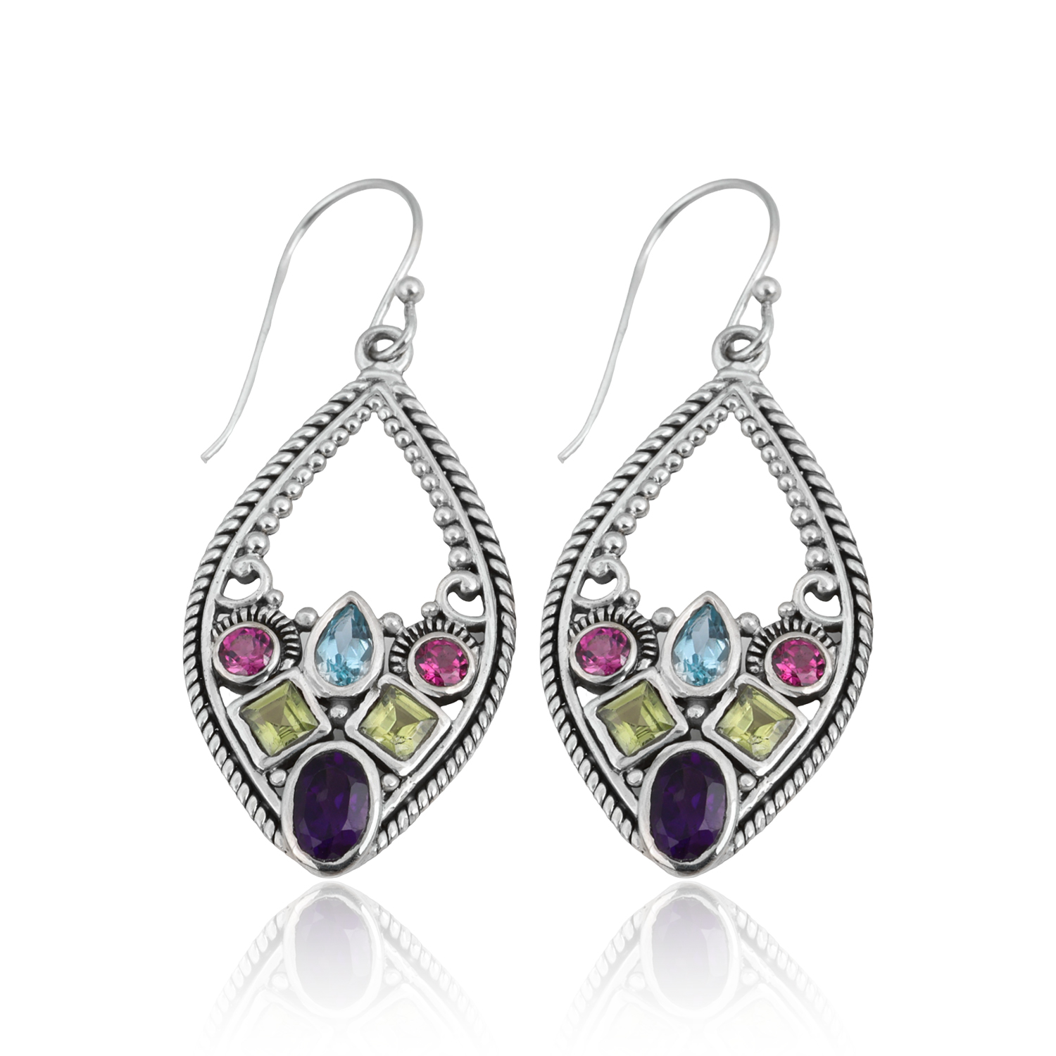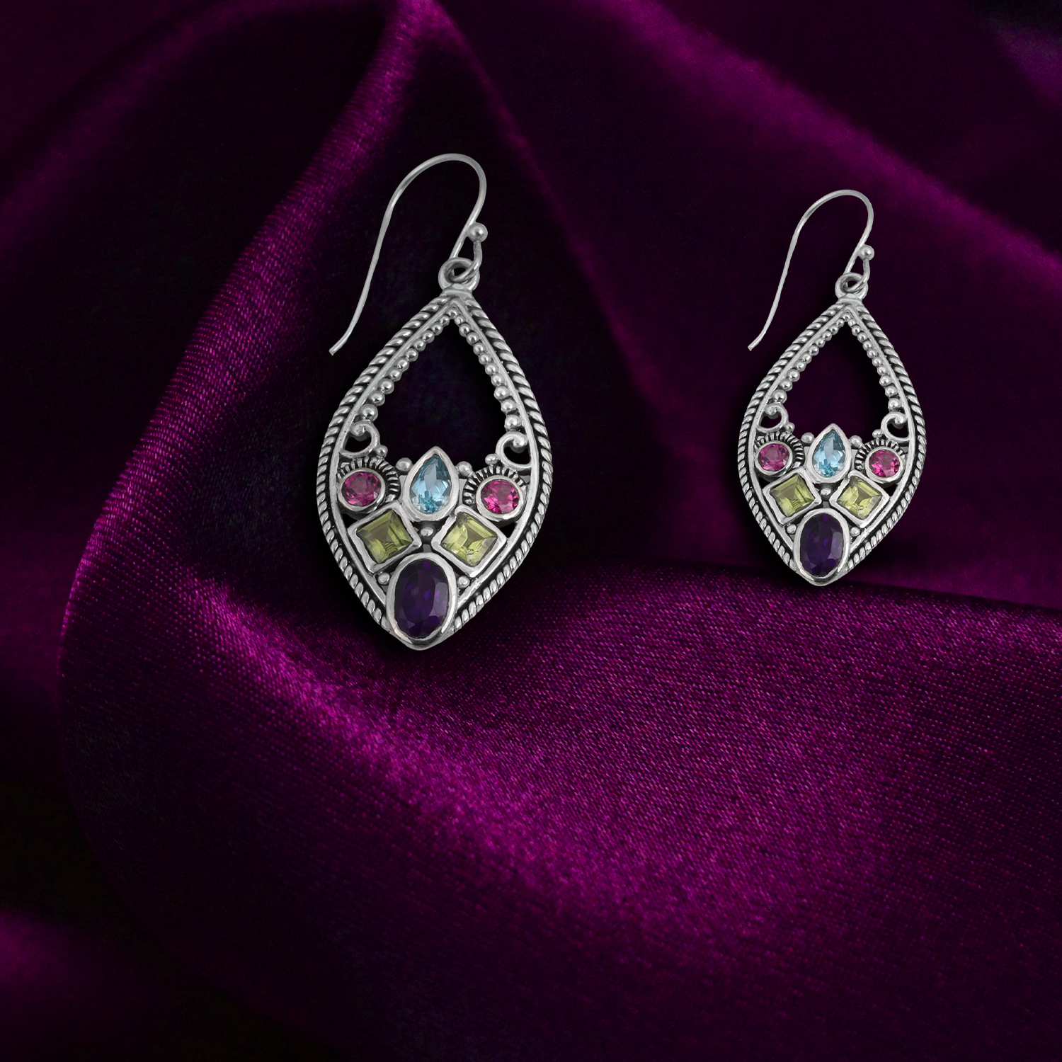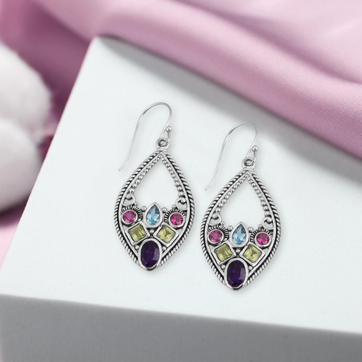 Bring vibrant elegance to your jewelry collection with Meadows 925 Sterling Silver Amethyst, Peridot & Blue Quartz Dangle Earrings ? a stunning combination of three natural gemstones, each radiating unique energy and color.