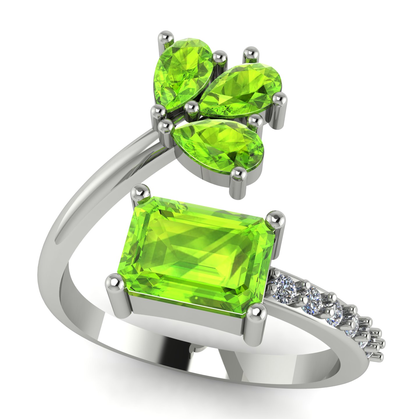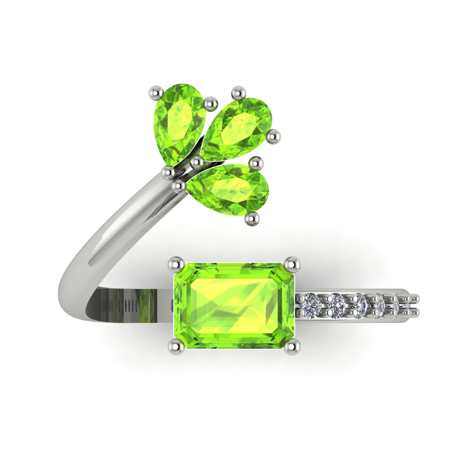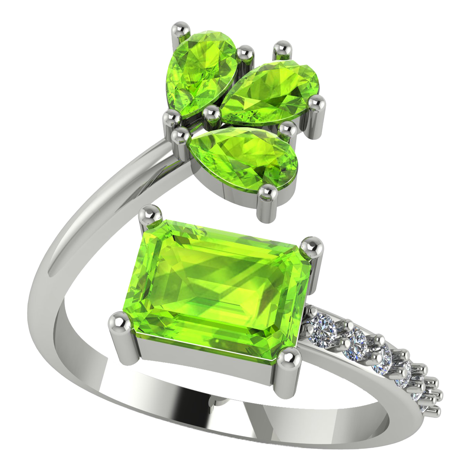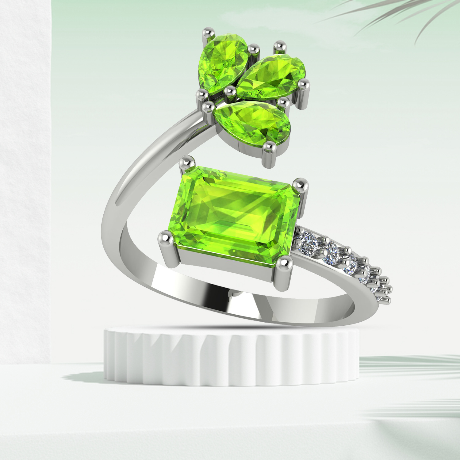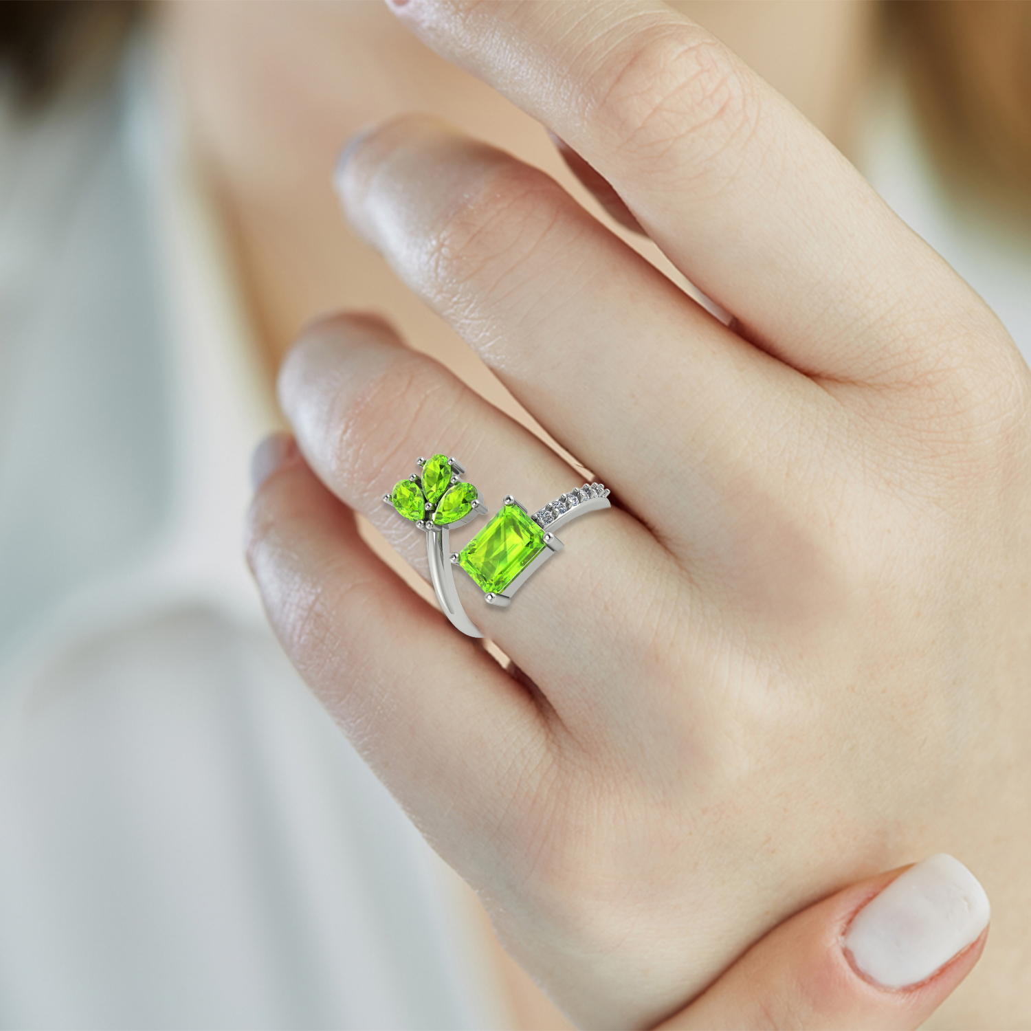 Add a touch of nature-inspired elegance to your jewelry collection with this stunning Peridot adjustable ring. The centerpiece features a radiant emerald-cut Peridot, celebrated for its vibrant green hue and refreshing brilliance. Enhancing the design are three pear-cut Peridot stones arranged in a floral cluster, creating a graceful and organic look. The band is adorned with a row of sparkling white accent stones, adding extra shimmer and sophistication.