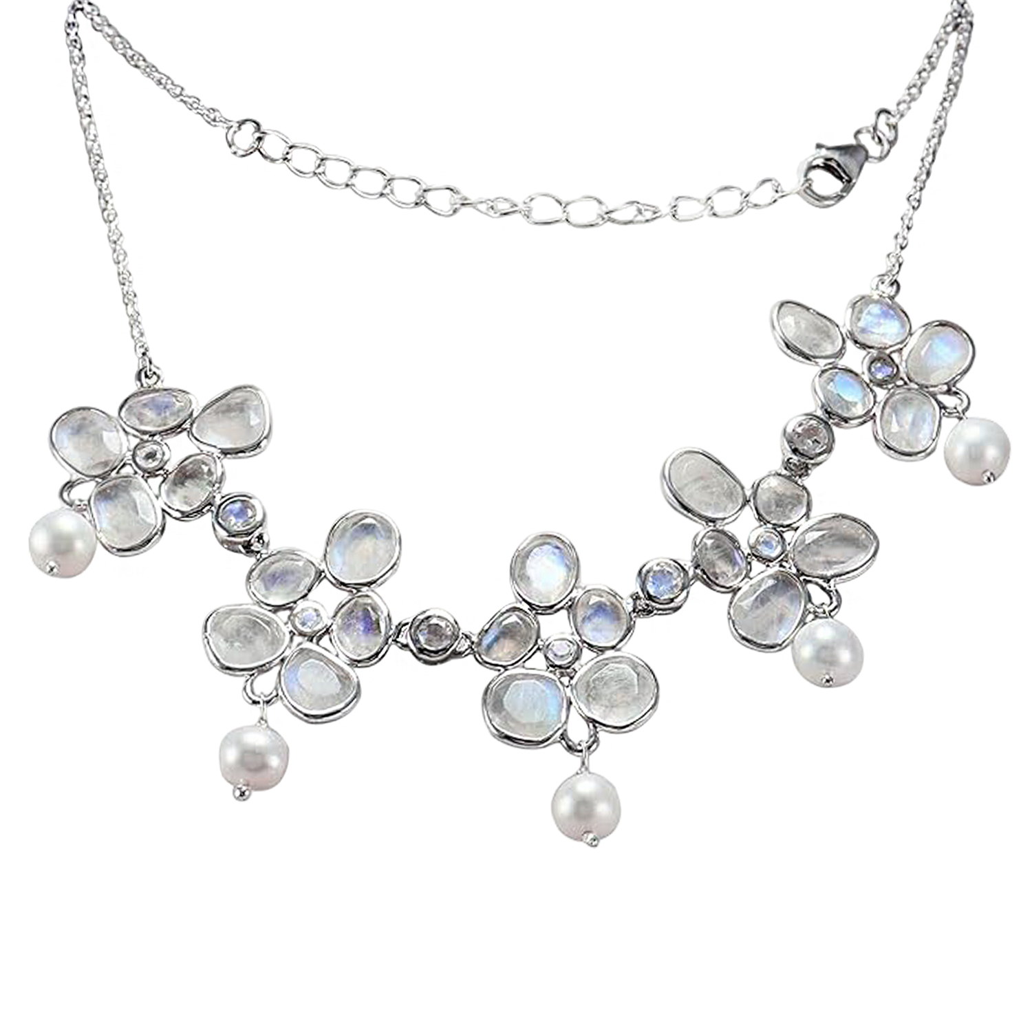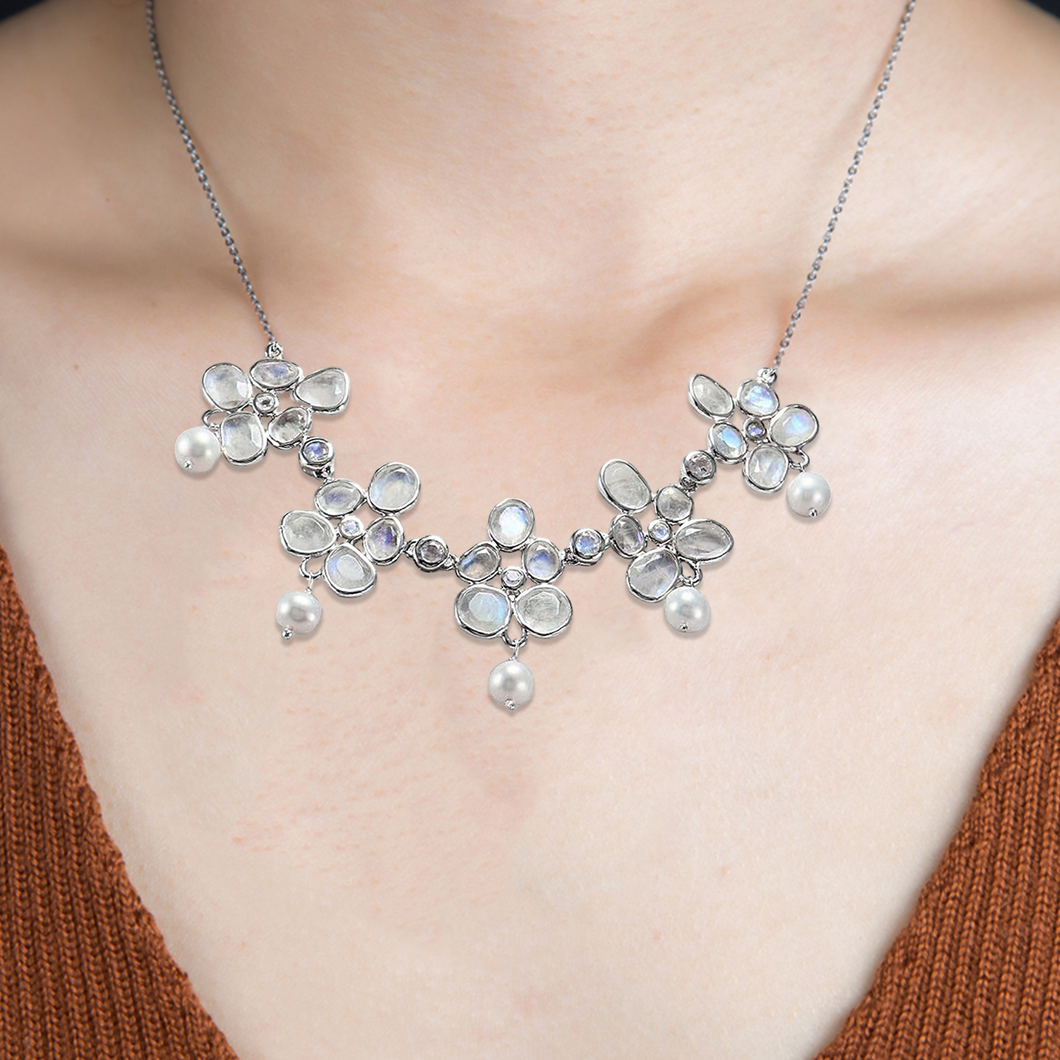 Experience the refined beauty of nature through the elegant design of this Meadows handcrafted necklace, made with hallmarked 925 Sterling Silver and adorned with natural Rainbow Moonstone and Freshwater Pearls.