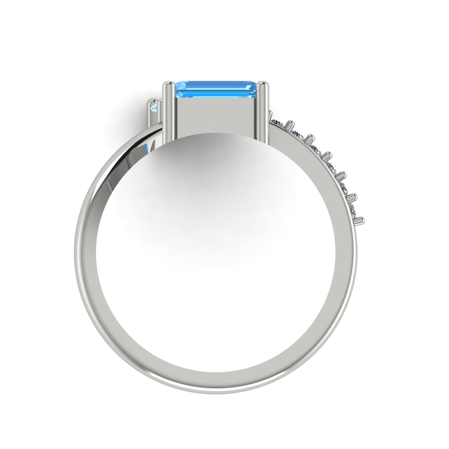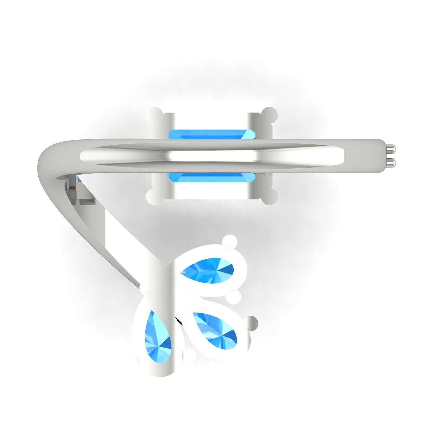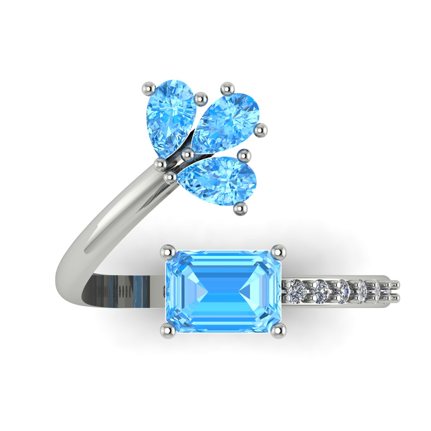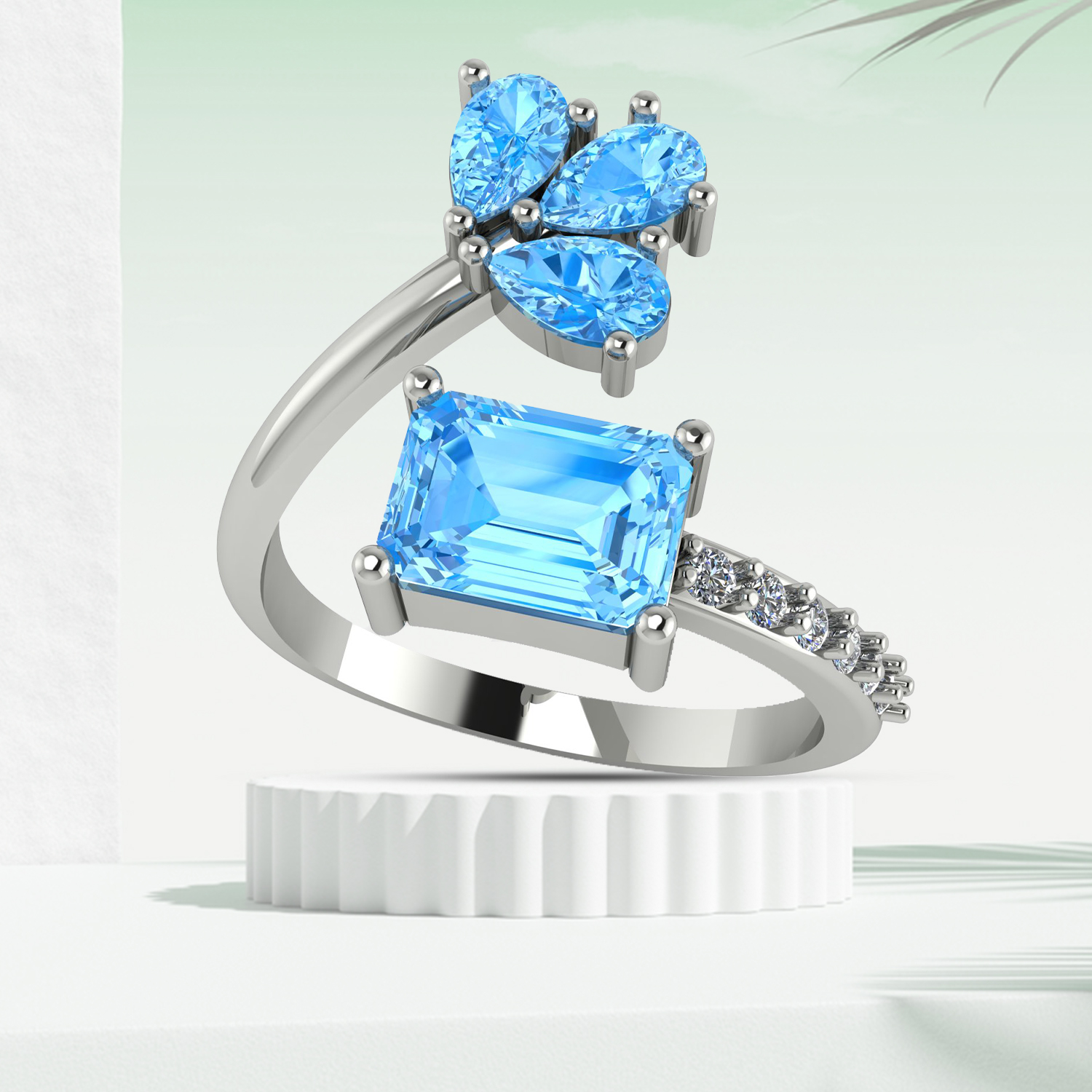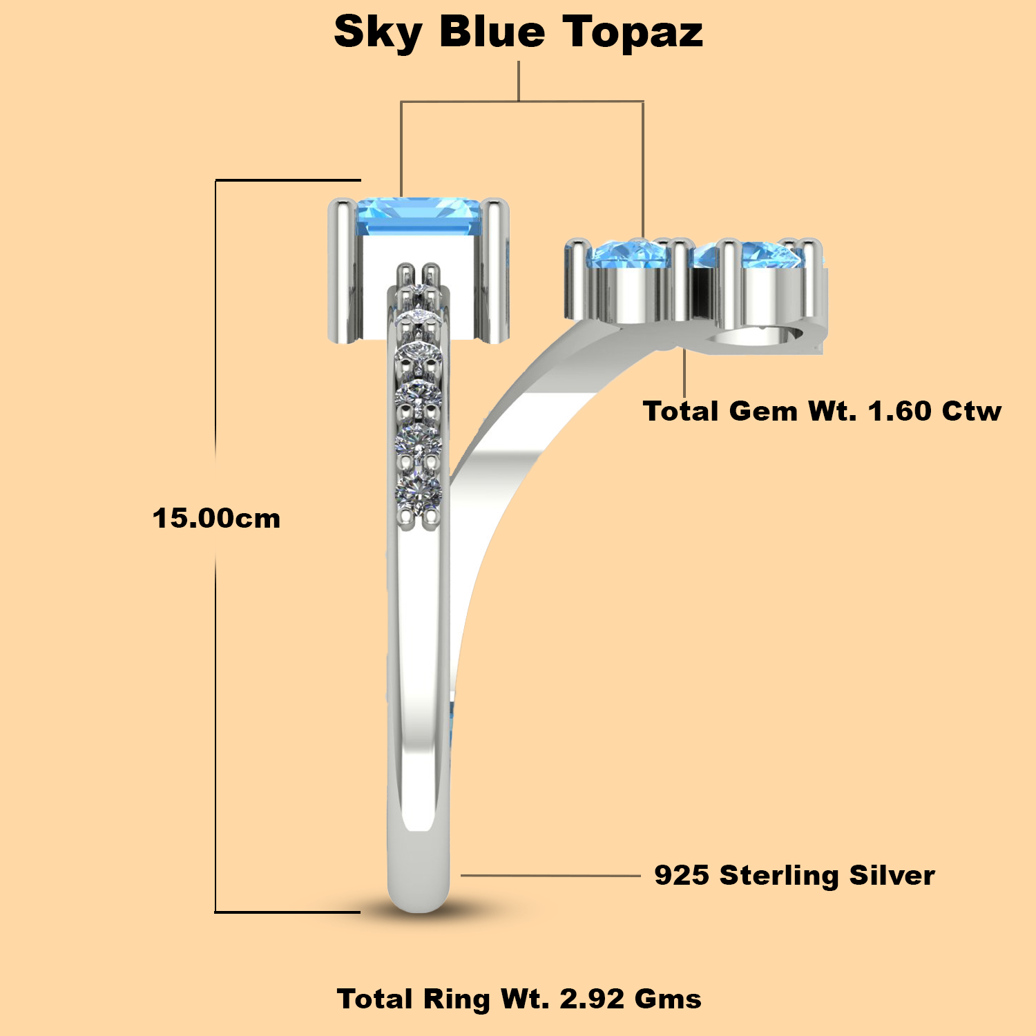 Add a splash of serene elegance to your jewelry collection with this captivating Sky Blue Topaz adjustable ring. The design features a dazzling emerald-cut Sky Blue Topaz at the center, radiating a soft and tranquil hue. Surrounding the centerpiece are three pear-cut Sky Blue Topaz stones, arranged in a delicate floral cluster, creating a graceful and charming aesthetic. The band is further adorned with a row of shimmering white accent stones, enhancing its brilliance and sophistication.