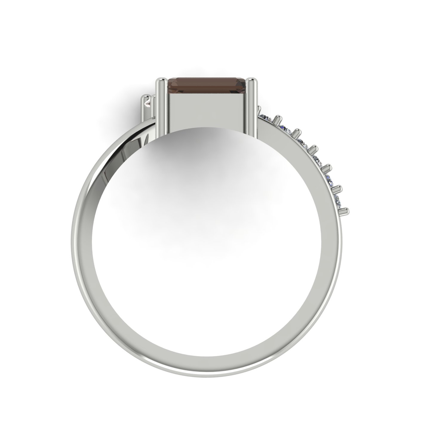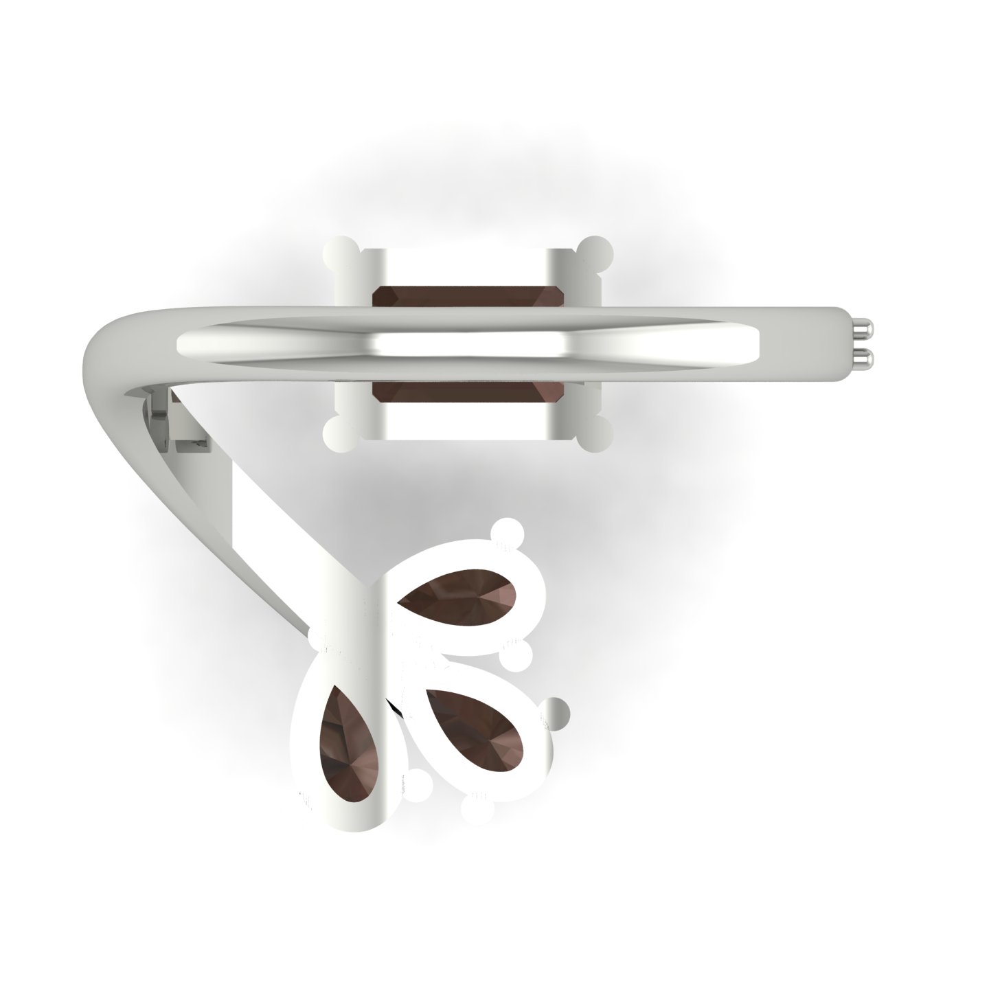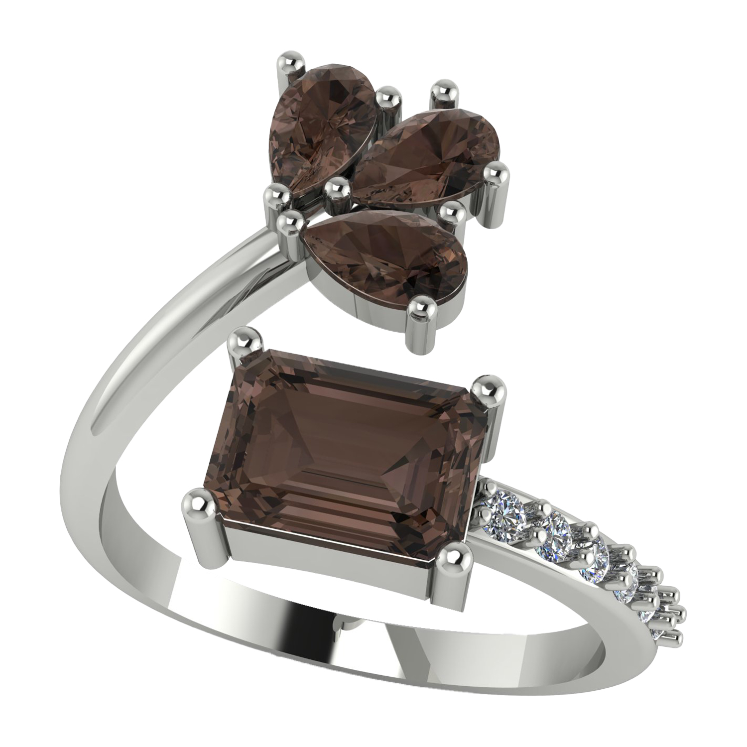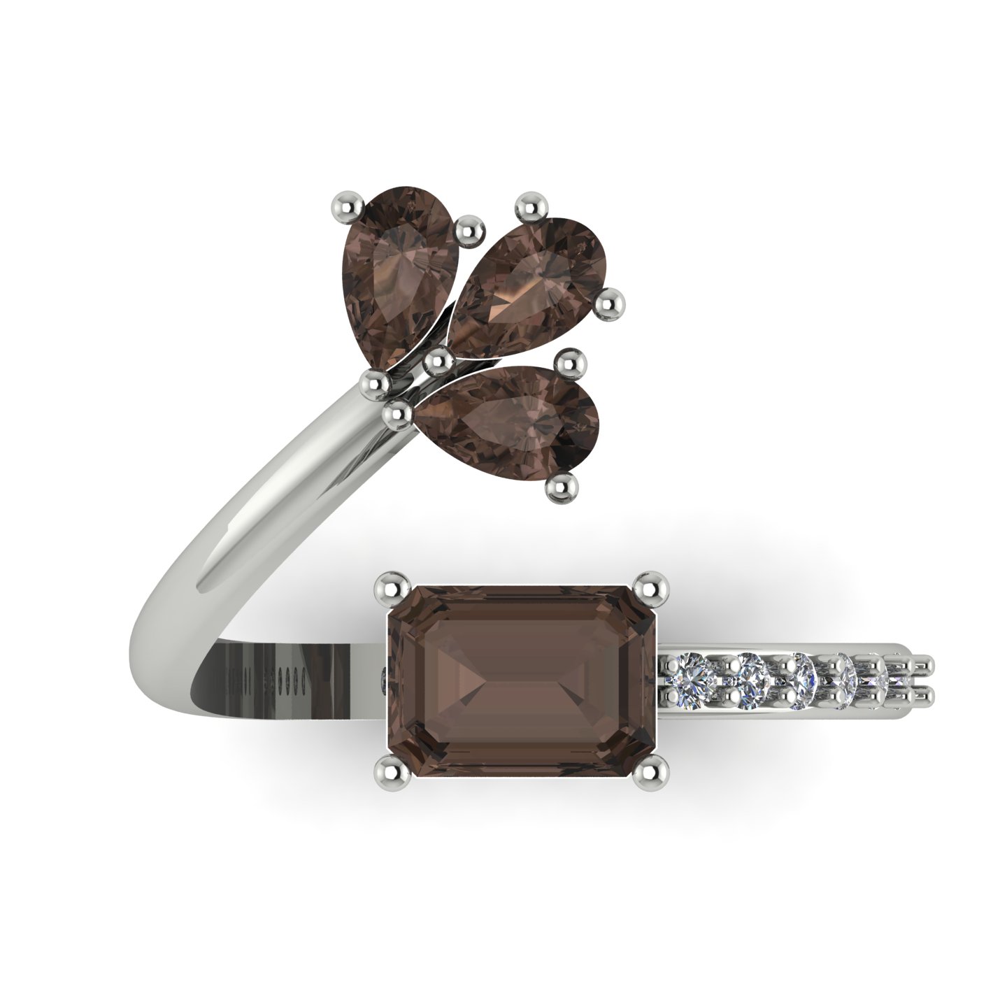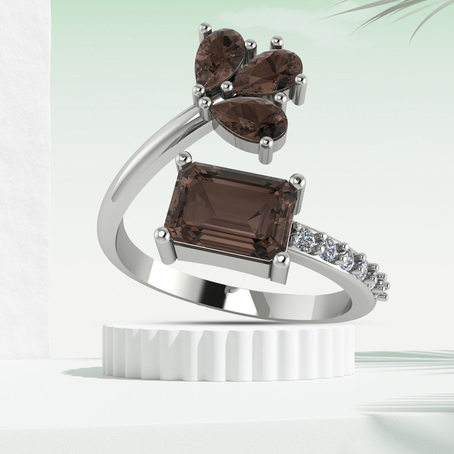 Embrace earthy elegance with this stunning Smoky Quartz adjustable ring. The centerpiece features a rich, emerald-cut Smoky Quartz, celebrated for its warm, chocolate-brown hue. Surrounding the center stone are three pear-cut Smoky Quartz gems, arranged in a delicate floral cluster, adding a touch of organic charm. The band is accented with a row of sparkling white stones, creating a striking contrast and enhancing the overall sophistication.