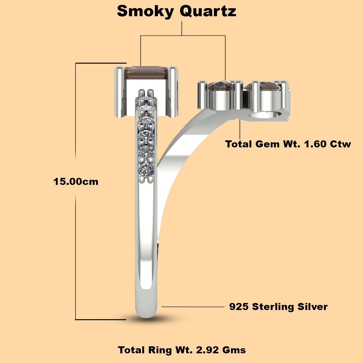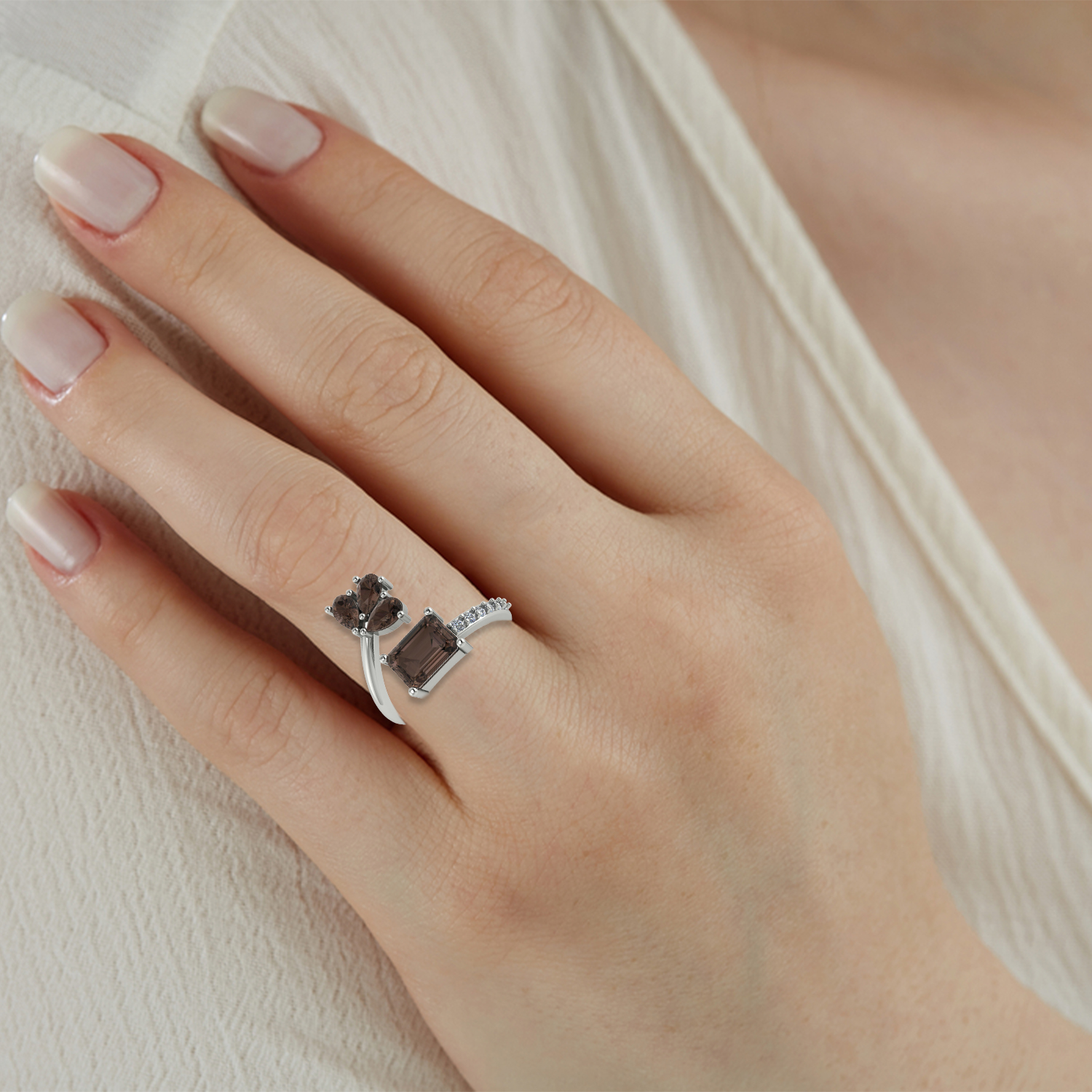 Embrace earthy elegance with this stunning Smoky Quartz adjustable ring. The centerpiece features a rich, emerald-cut Smoky Quartz, celebrated for its warm, chocolate-brown hue. Surrounding the center stone are three pear-cut Smoky Quartz gems, arranged in a delicate floral cluster, adding a touch of organic charm.