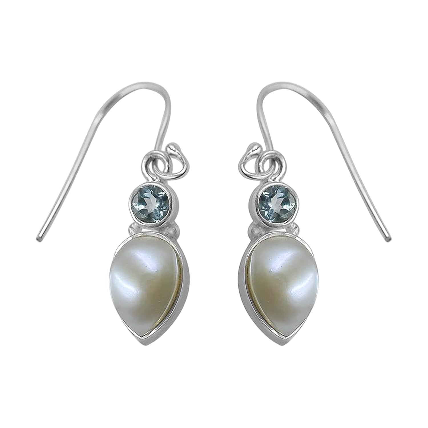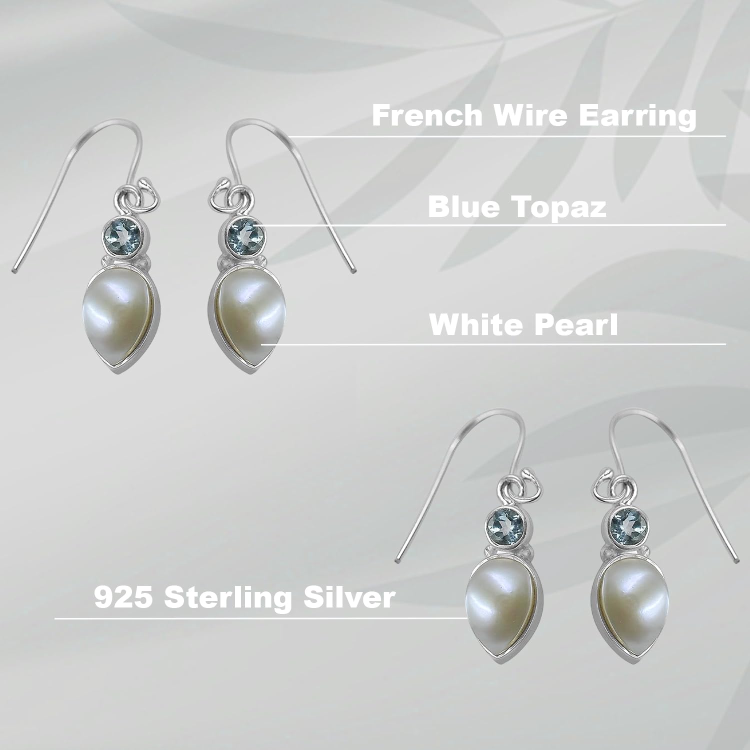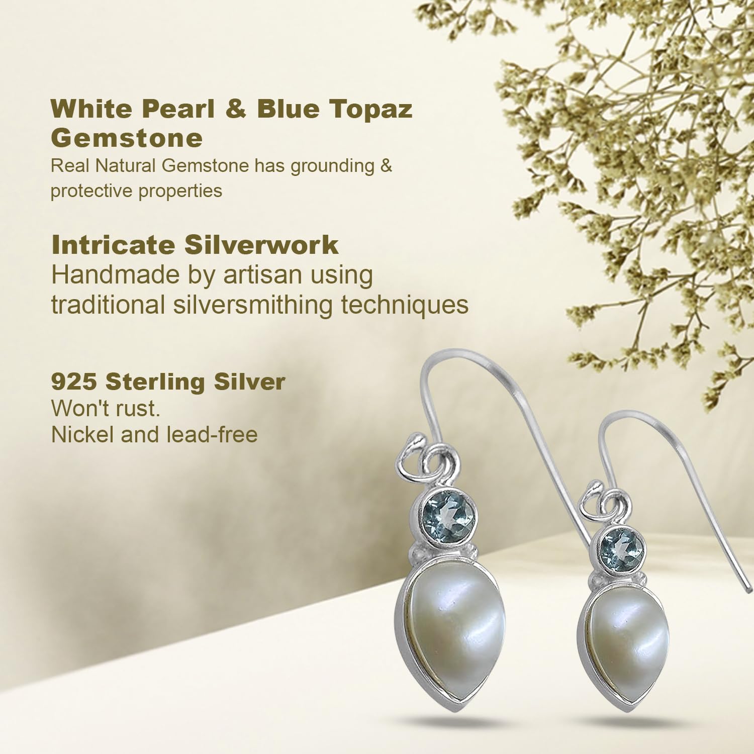 White Pearl & Blue Topaz Earring For Women, Handmade Dangle 925 Sterling Silver Earring mothers day gifts